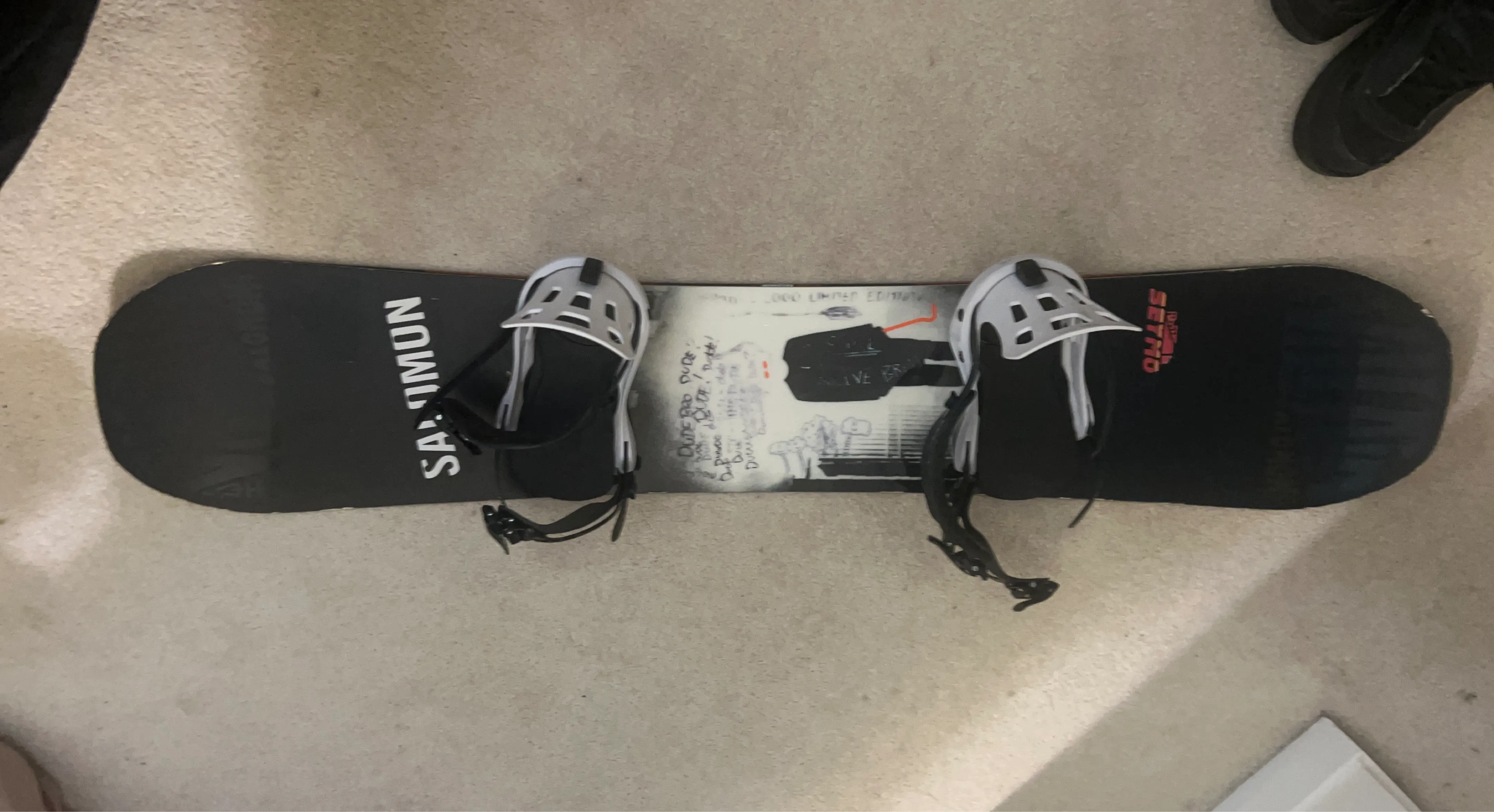 This is a Salomon snowboard that comes with bindings. It's a great setup for hitting the slopes. Built for riding and it also has 2 parts that were repaired with p Tex and then was used for a season but it worked perfectly , and then I stopped snowboarding and bindings fit up to 9-9.5 bring boots to check also have a bunch of other snowboard stuff just shoot me a message and ask I’ll show u.