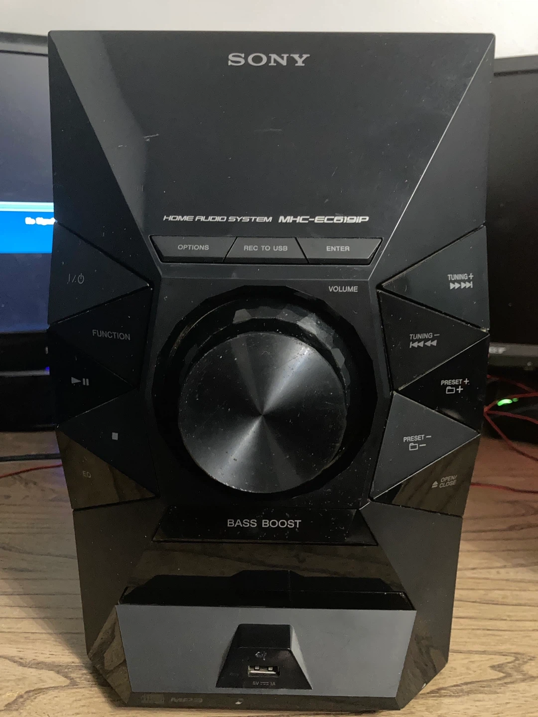 Selling a Sony MHC-EC619iP home stereo system has a few dings and scratches but is in good working condition.