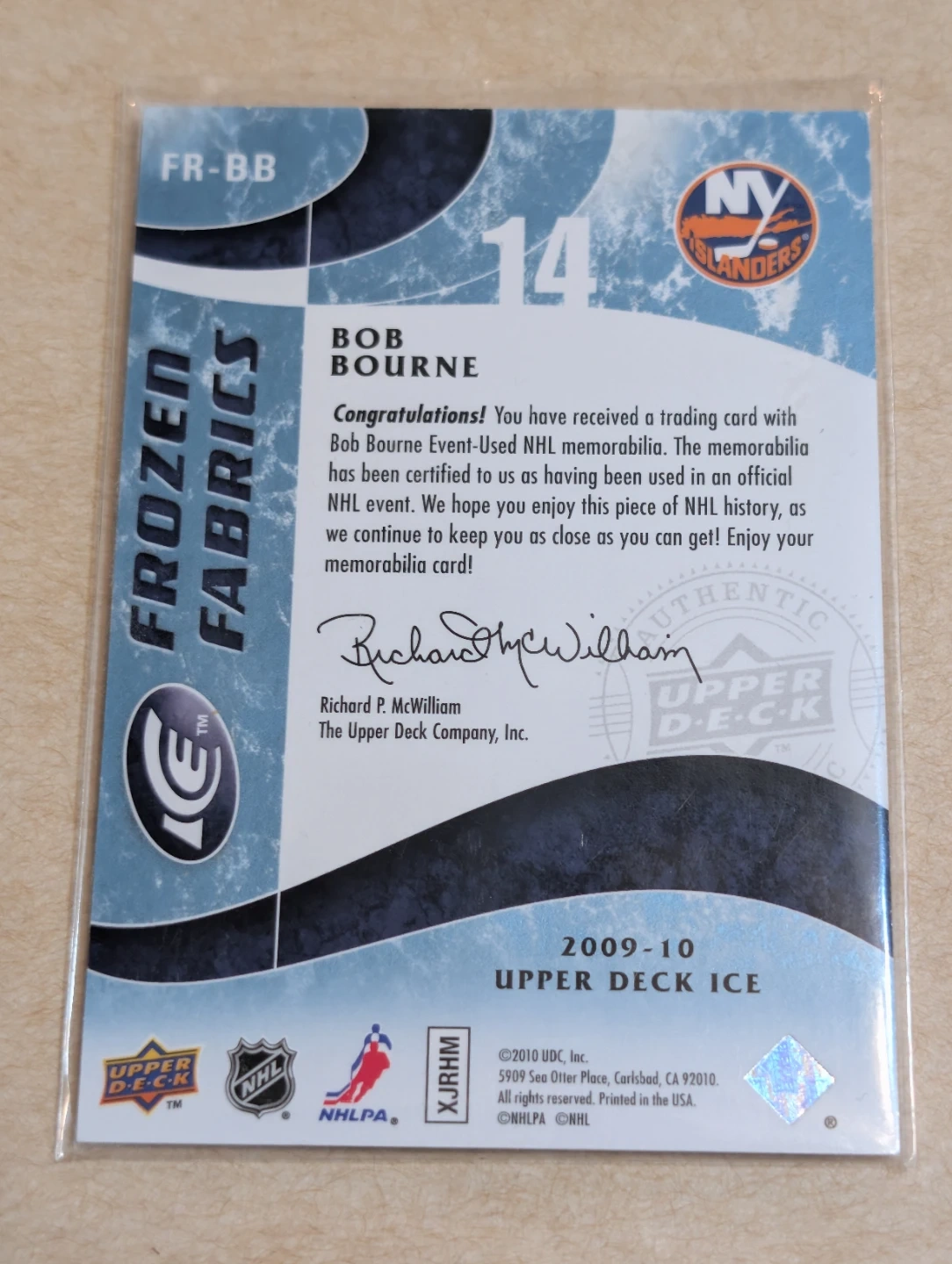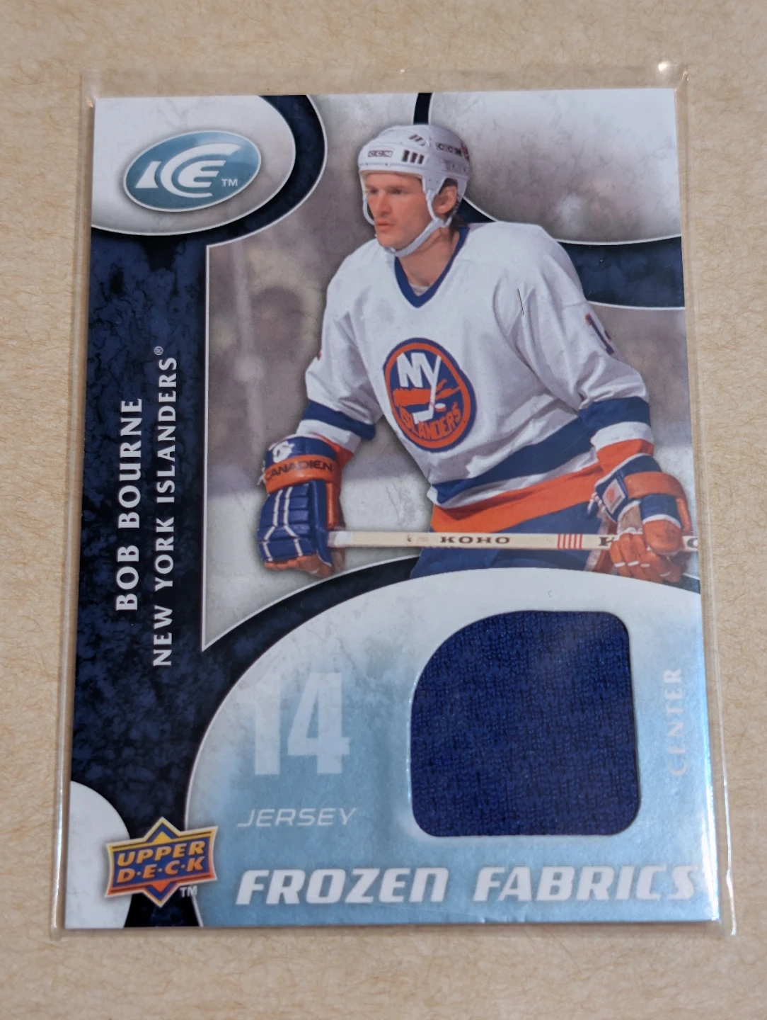 This is a 2009-10 Upper Deck ICE Frozen Fabrics trading card featuring Bob Bourne. It includes a piece of memorabilia from an official NHL event. The card highlights Bob Bourne's number 14 and is from the New York Islanders team. It's a great collectible for hockey fans!