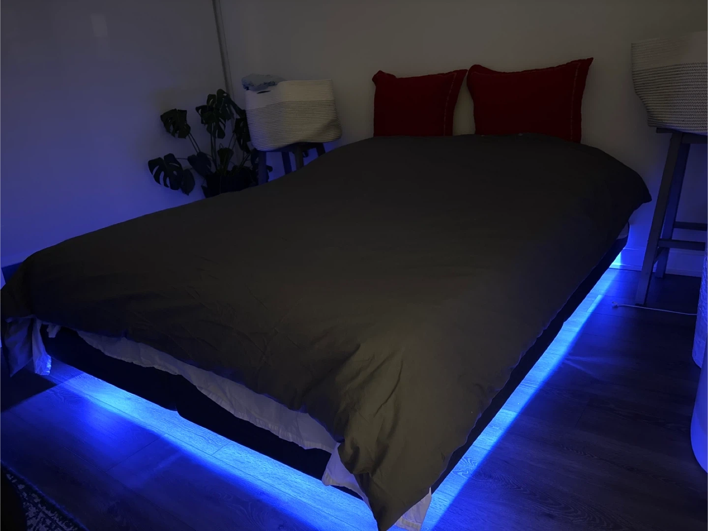 3 months old Queen size metal bed frame upholstered in dark grey fabric and black colored frame. It includes a 2.4G remote controller for the LED lights. Easy assembly, no box spring needed. Mattress not included.