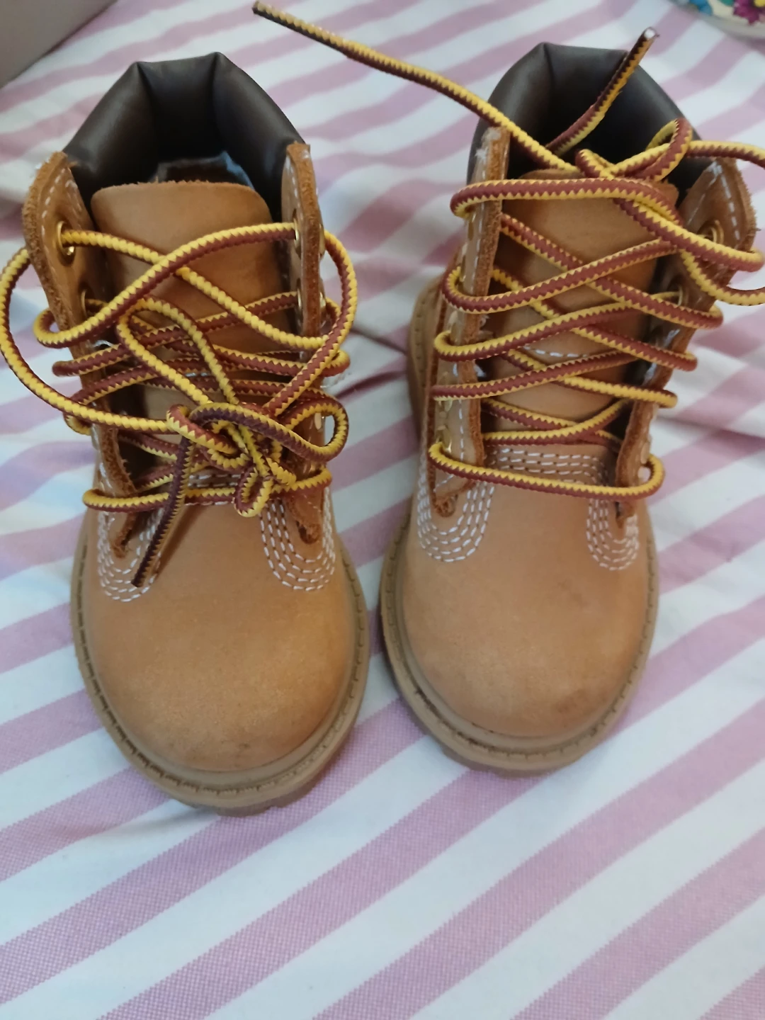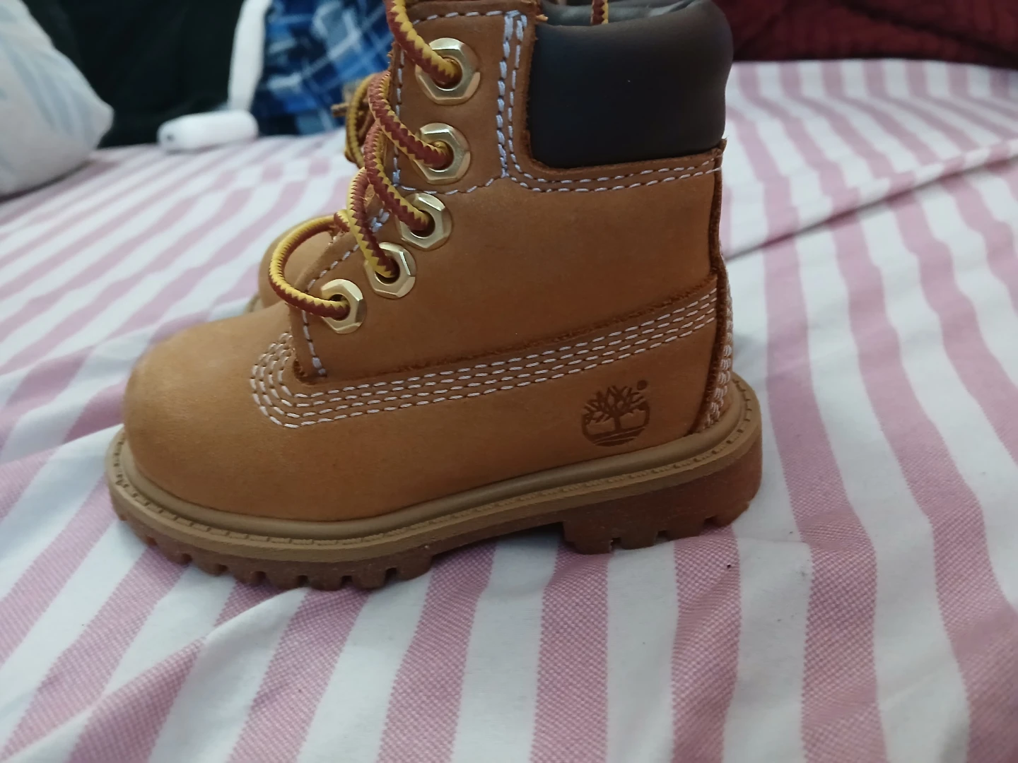 Classic tan Timberland boots for toddlers. Features durable construction and iconic lacing. Perfect for little adventurers!