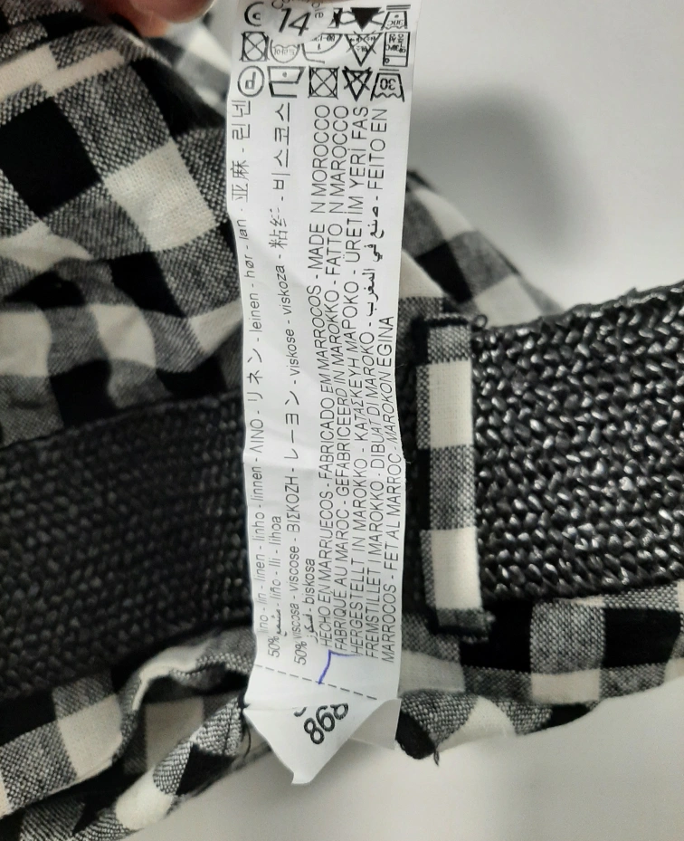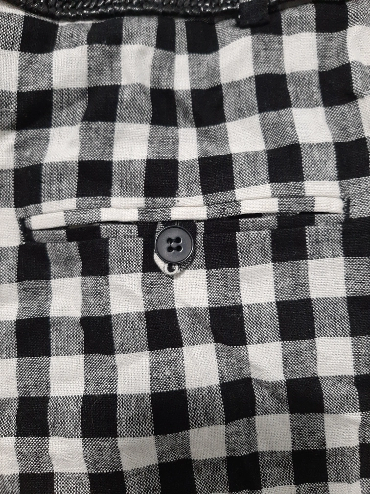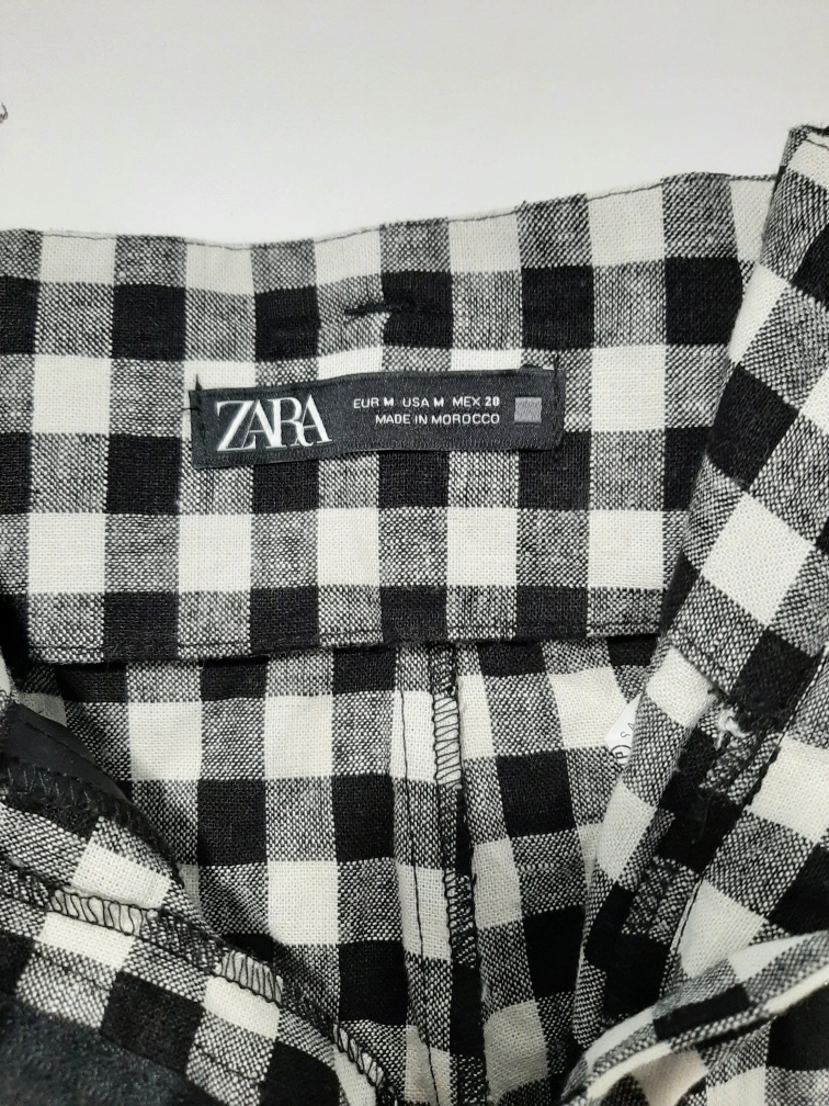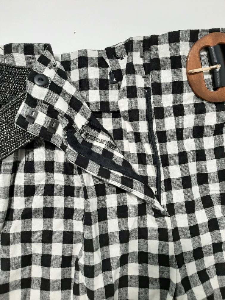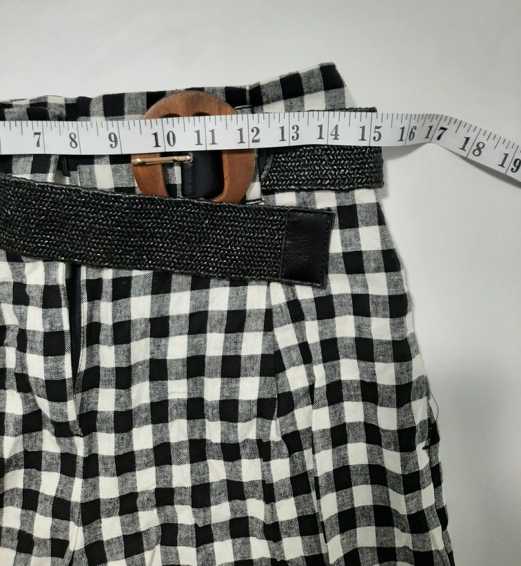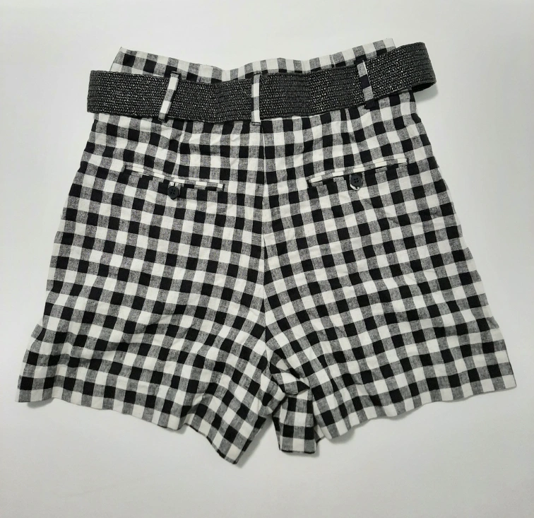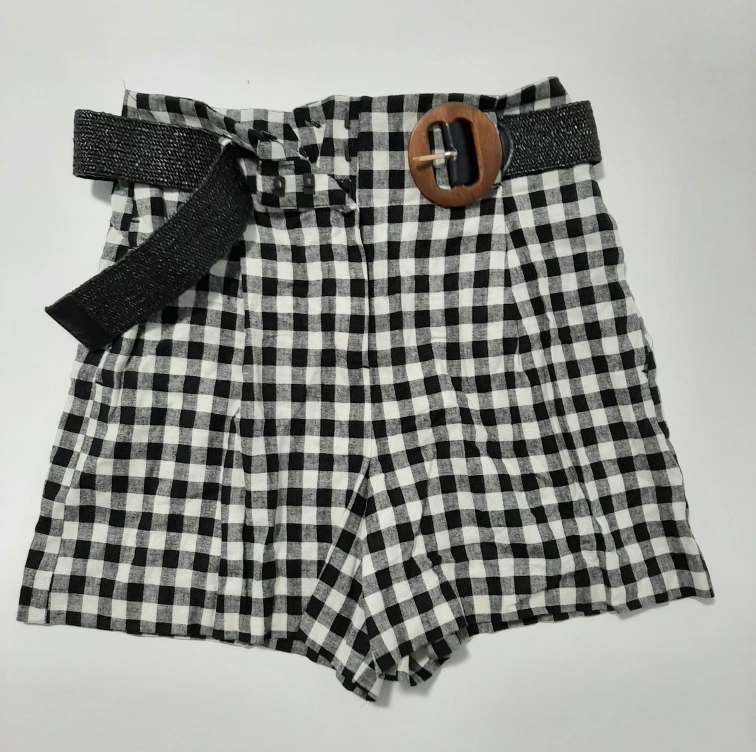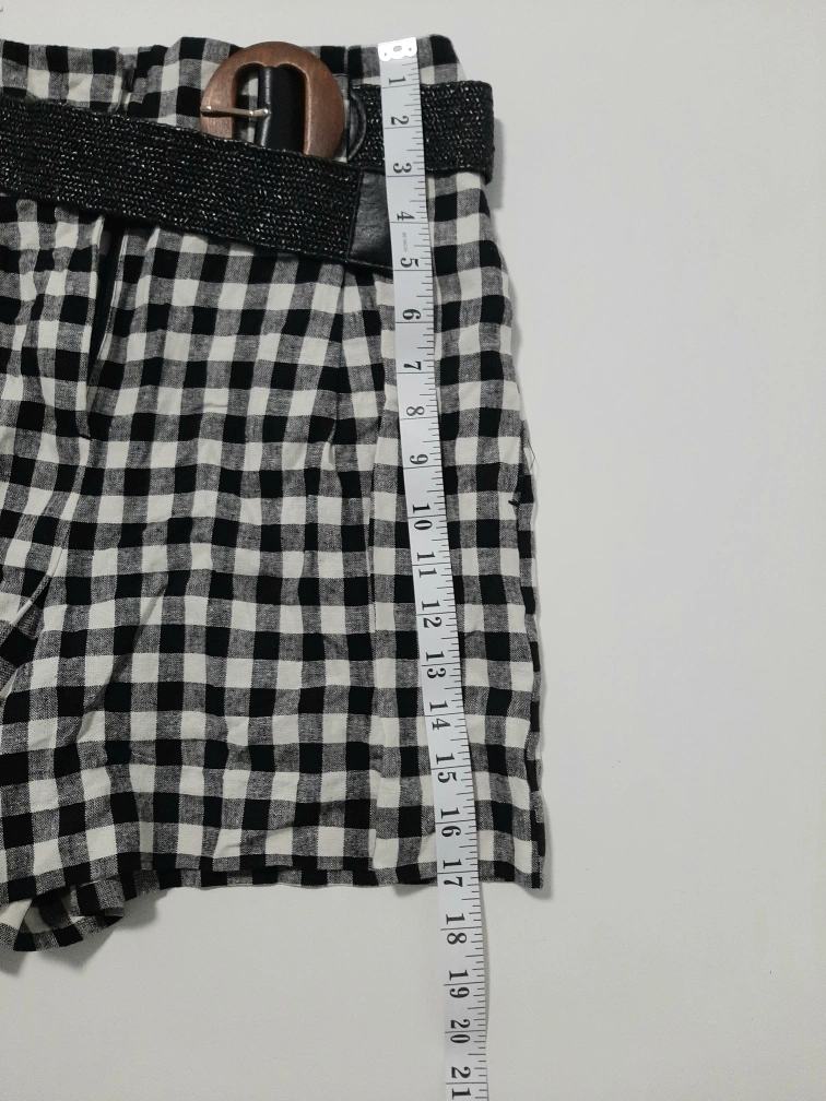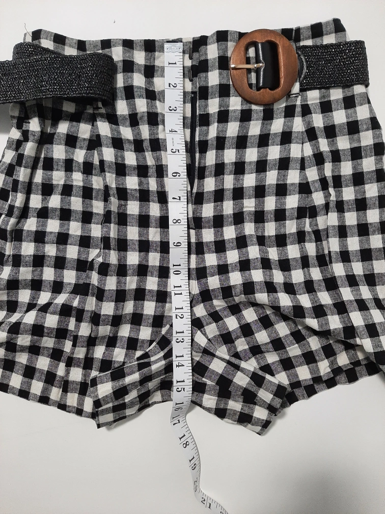 Women's shorts. Black and white gingham pattern. High-waisted. Features a black woven belt with a large wooden buckle. Pleated detail. Size M.