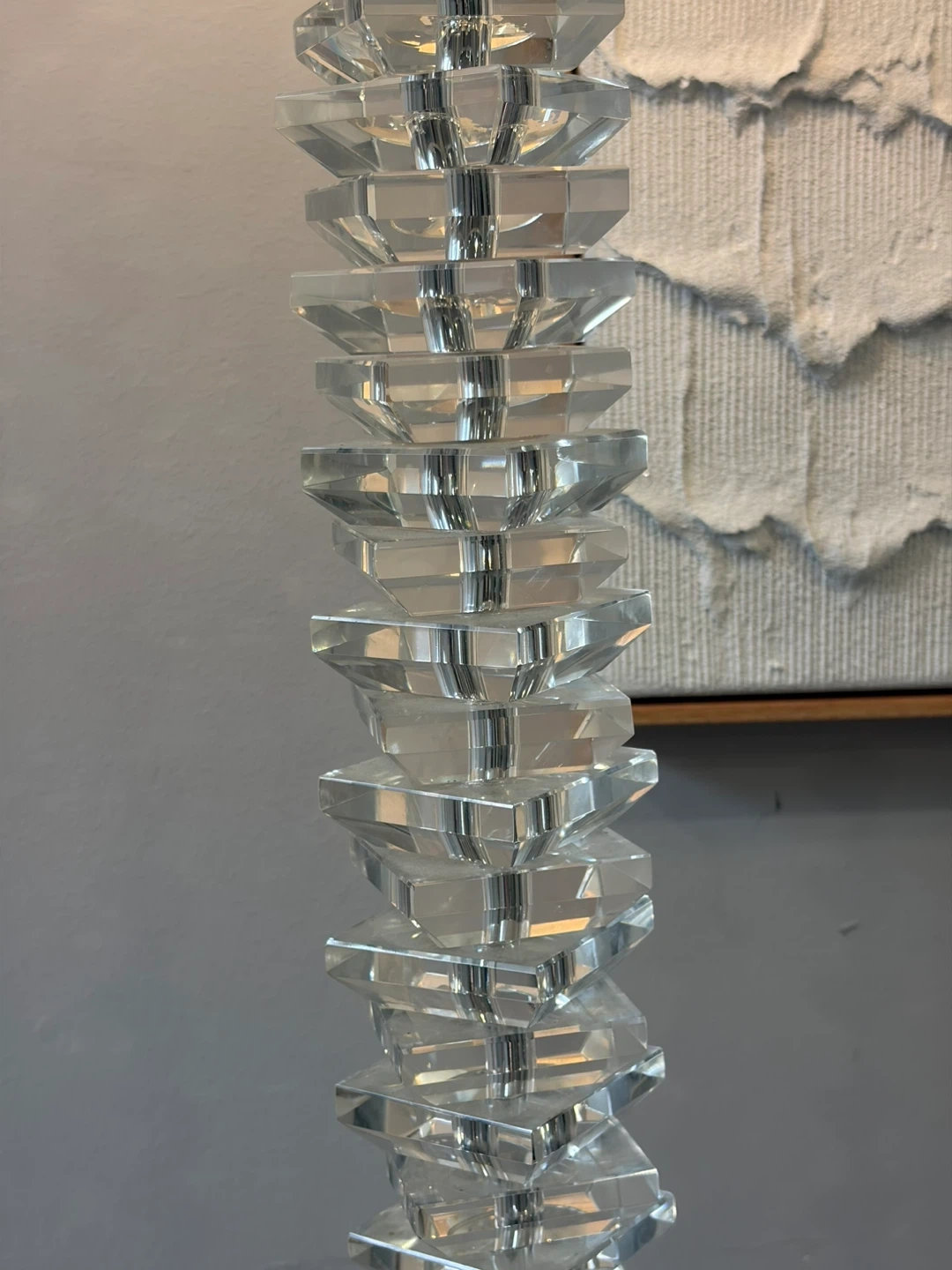 This lamp features a stacked crystal-style column that beautifully reflects light and adds a modern glam look to any space. The slim profile makes it perfect for corners or beside sofas and accent chairs.