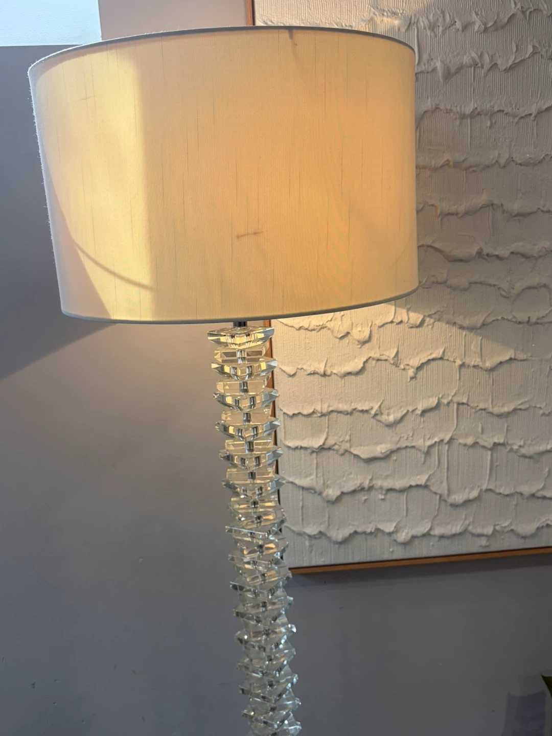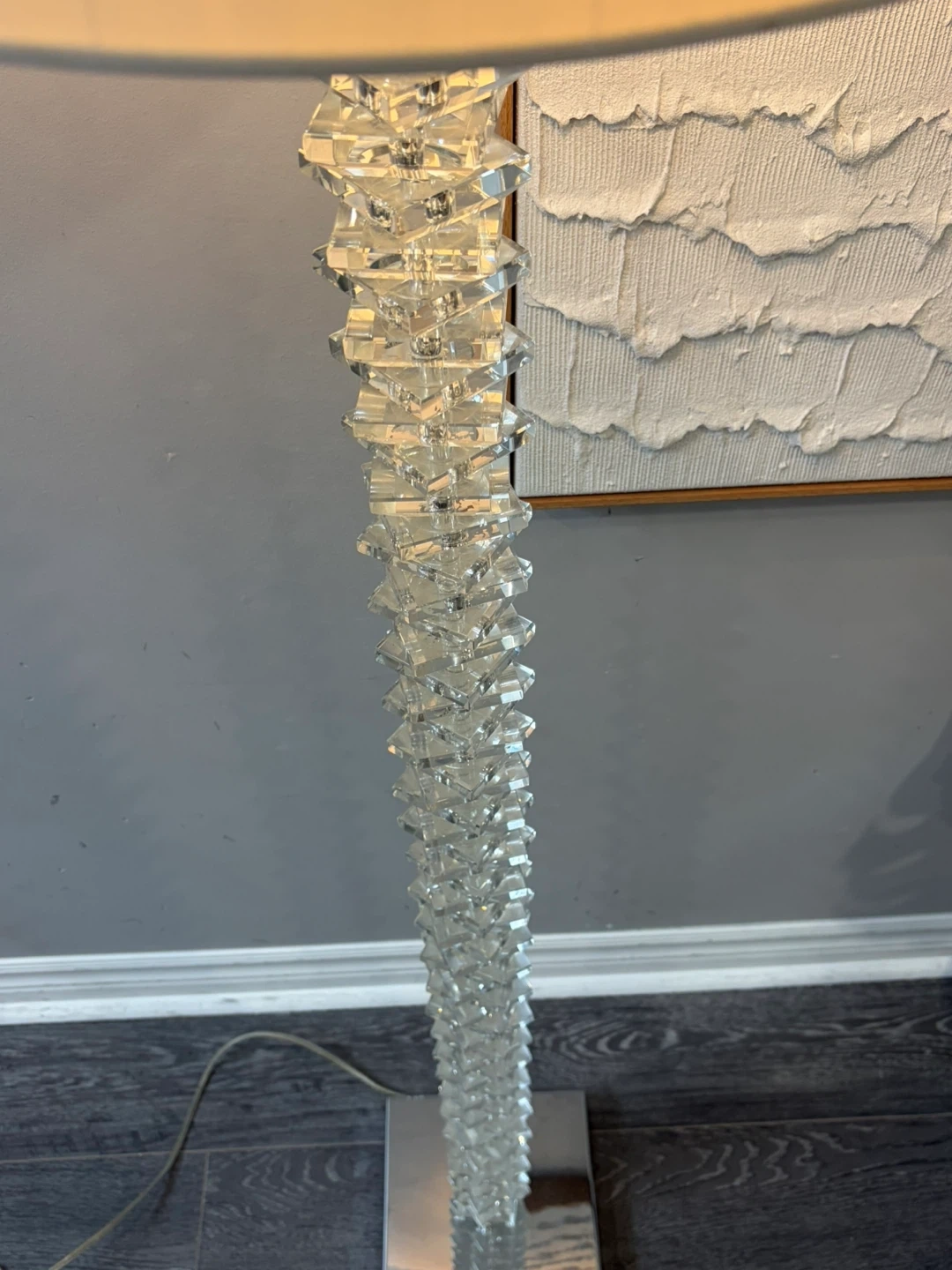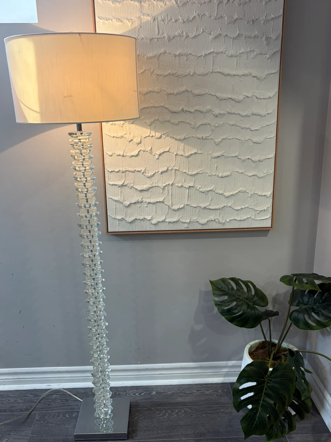 This lamp features a stacked crystal-style column that beautifully reflects light and adds a modern glam look to any space. The slim profile makes it perfect for corners or beside sofas and accent chairs.