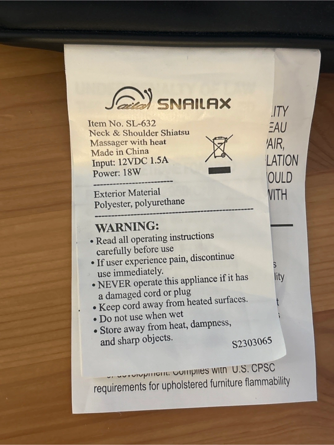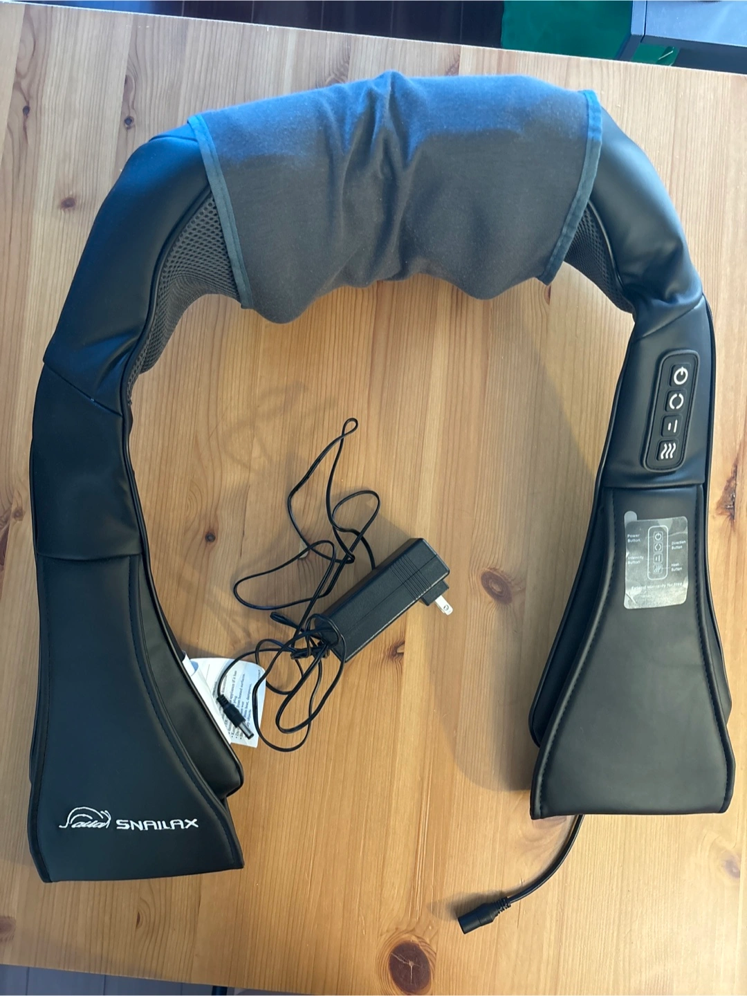 106I'm selling a Snailax Neck & Shoulder Shiatsu Massager with heat. It's in great condition and ready to help you relax! It comes with the power adapter. - Item No. SL-632 - Exterior Material: Polyester, polyurethane