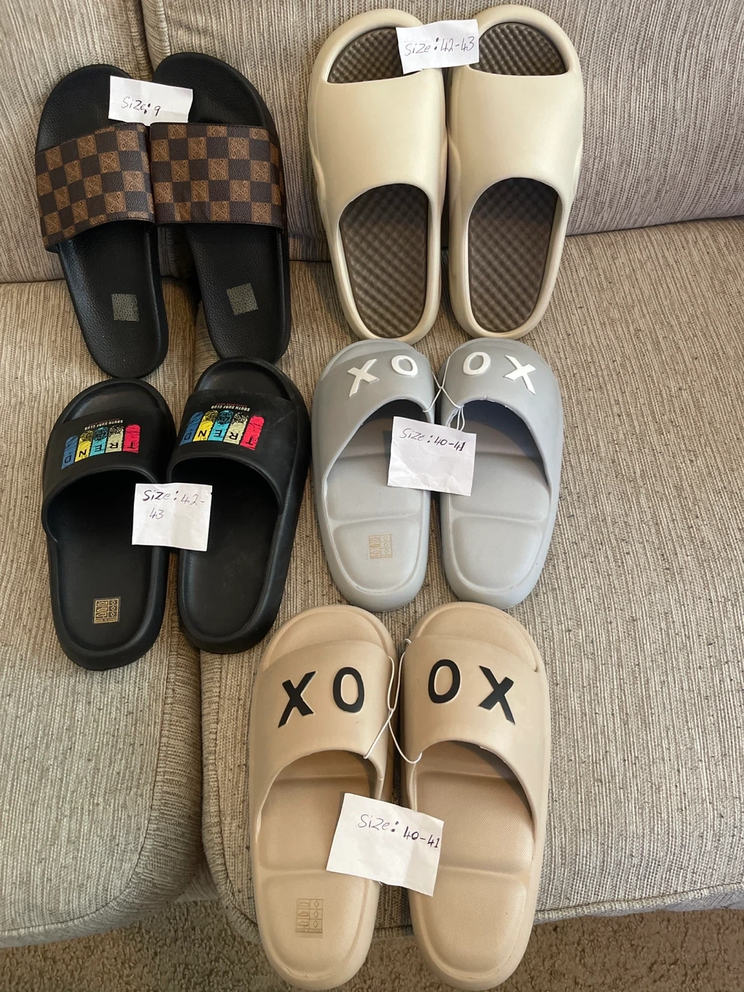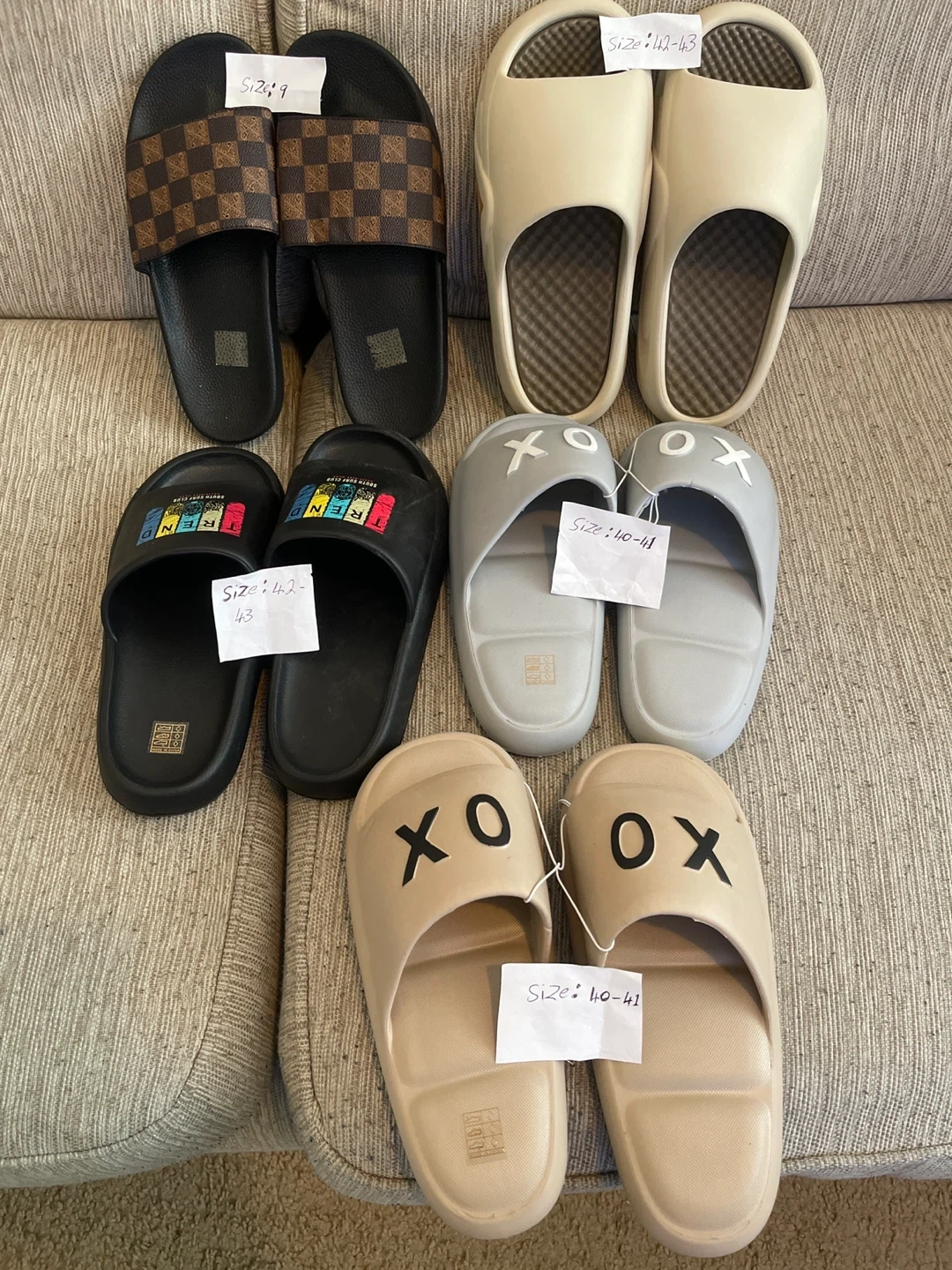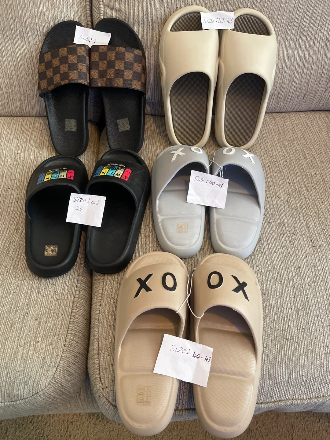 Variety of slides available for purchase. Includes checkered, colourful text, plain cream, and 'XO' designs. Sizes range from 10-11 to 12-13 as marked. Great for casual wear!