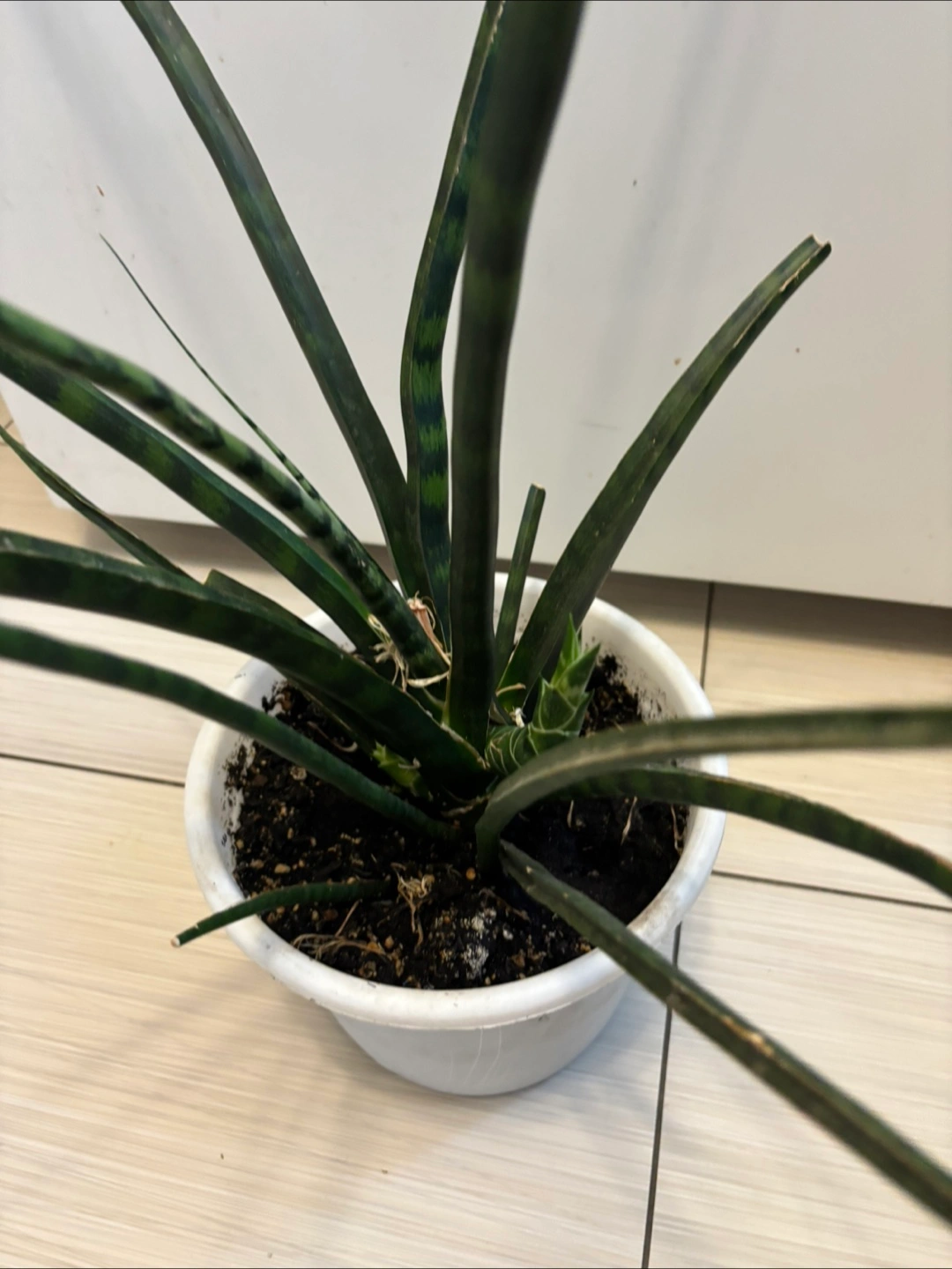 A healthy snake plant in a simple white pot, ready to bring some greenery to your space! It's super easy to care for and great for purifying the air