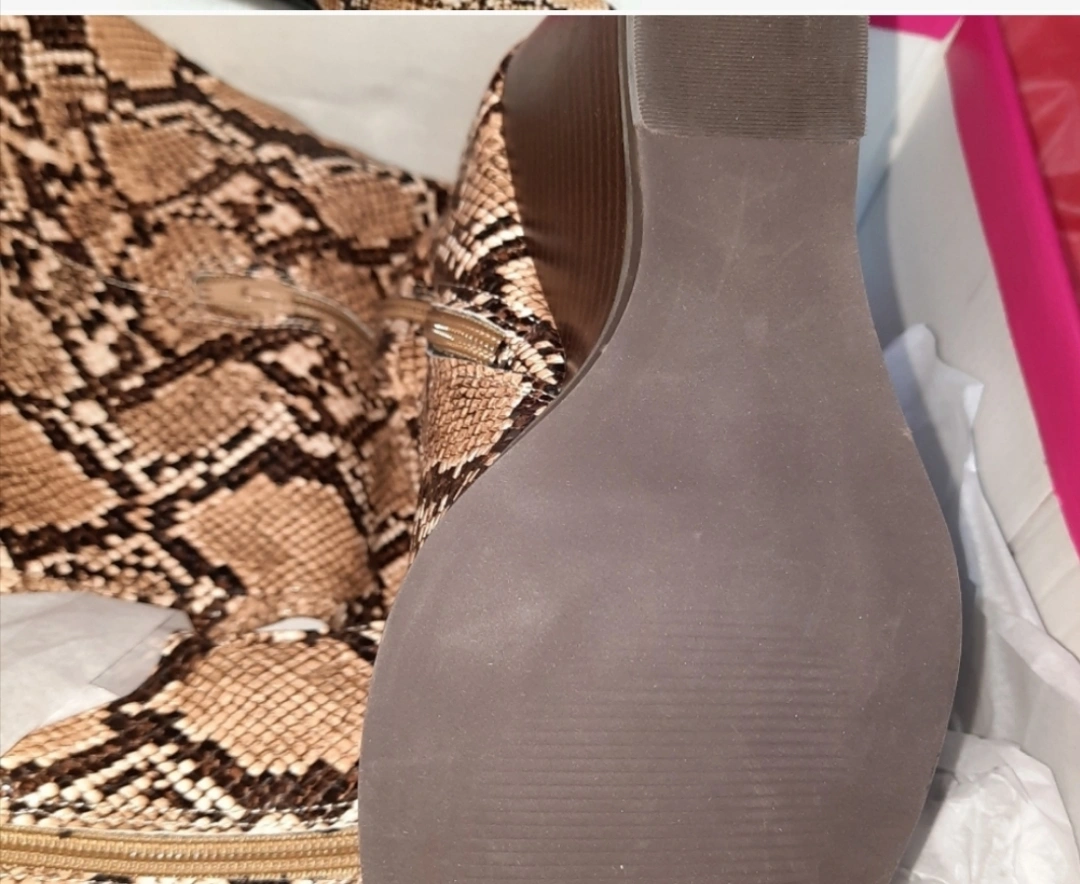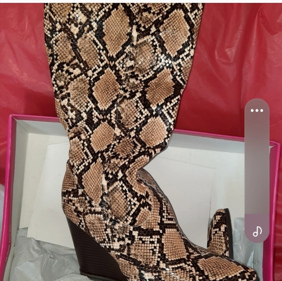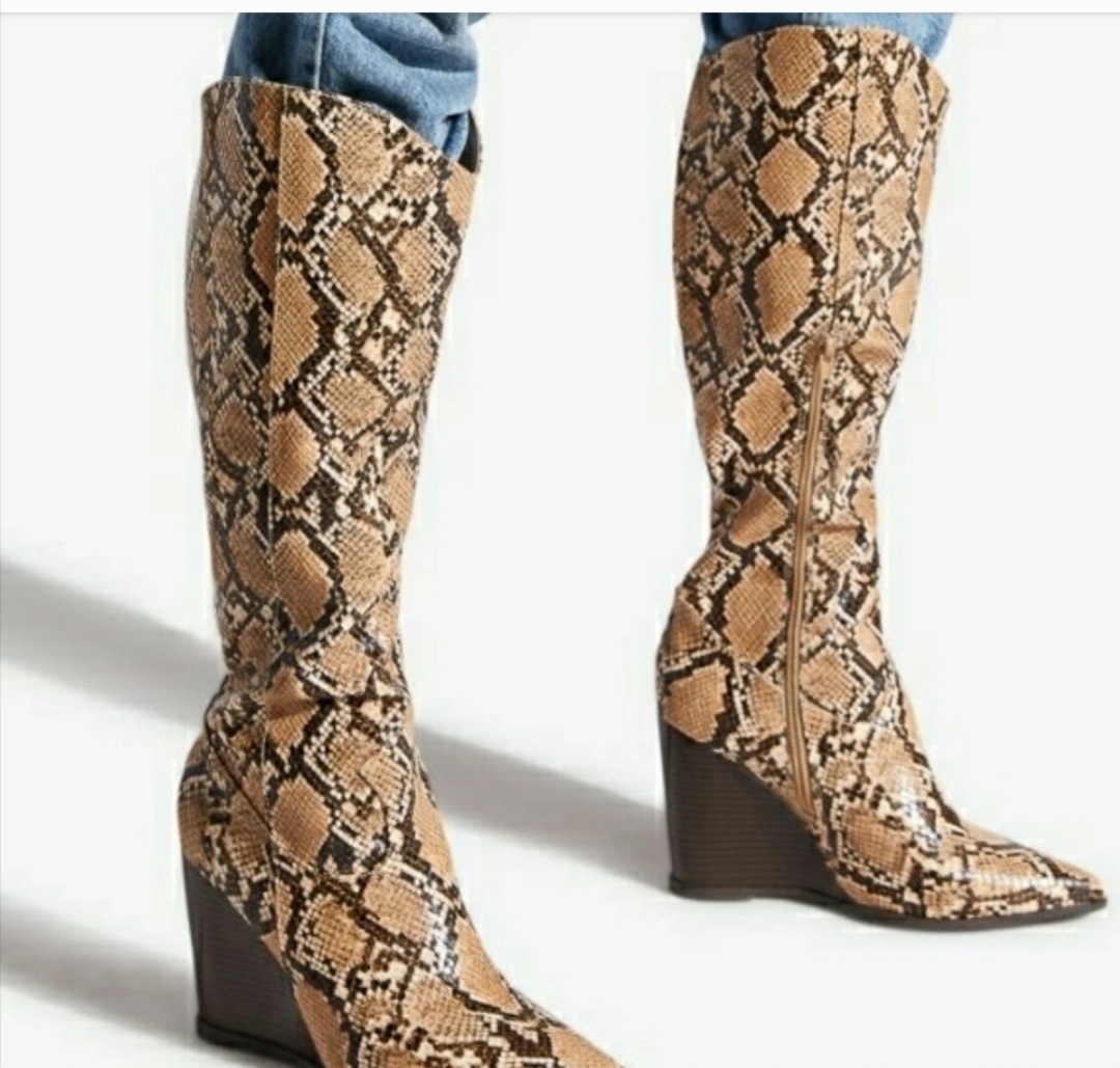 Brown and beige snakeskin print. Knee-high boots. Wedge heel. Side zipper. Pointed toe. Wide fit, never worn.