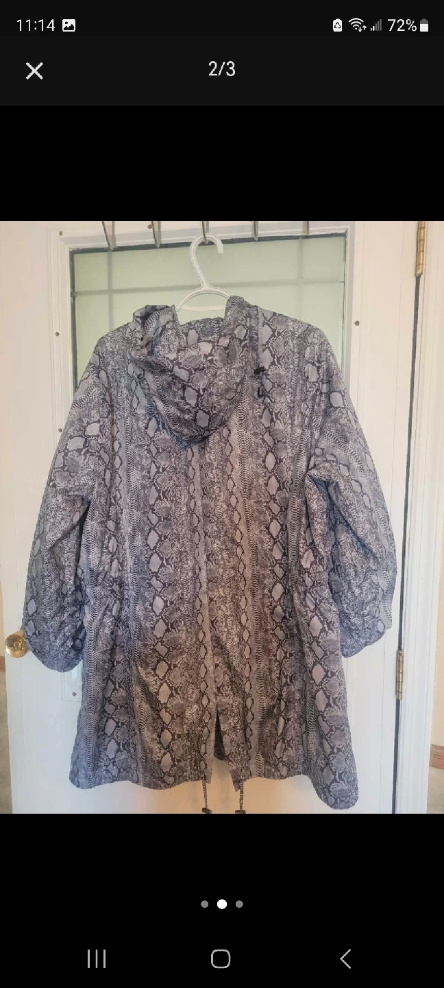 25Selling a rain jacket with a snakeskin print. It's in great condition and ready to keep you dry on those rainy days! The jacket features a hood and a drawstring at the waist for a customizable fit worn 2x