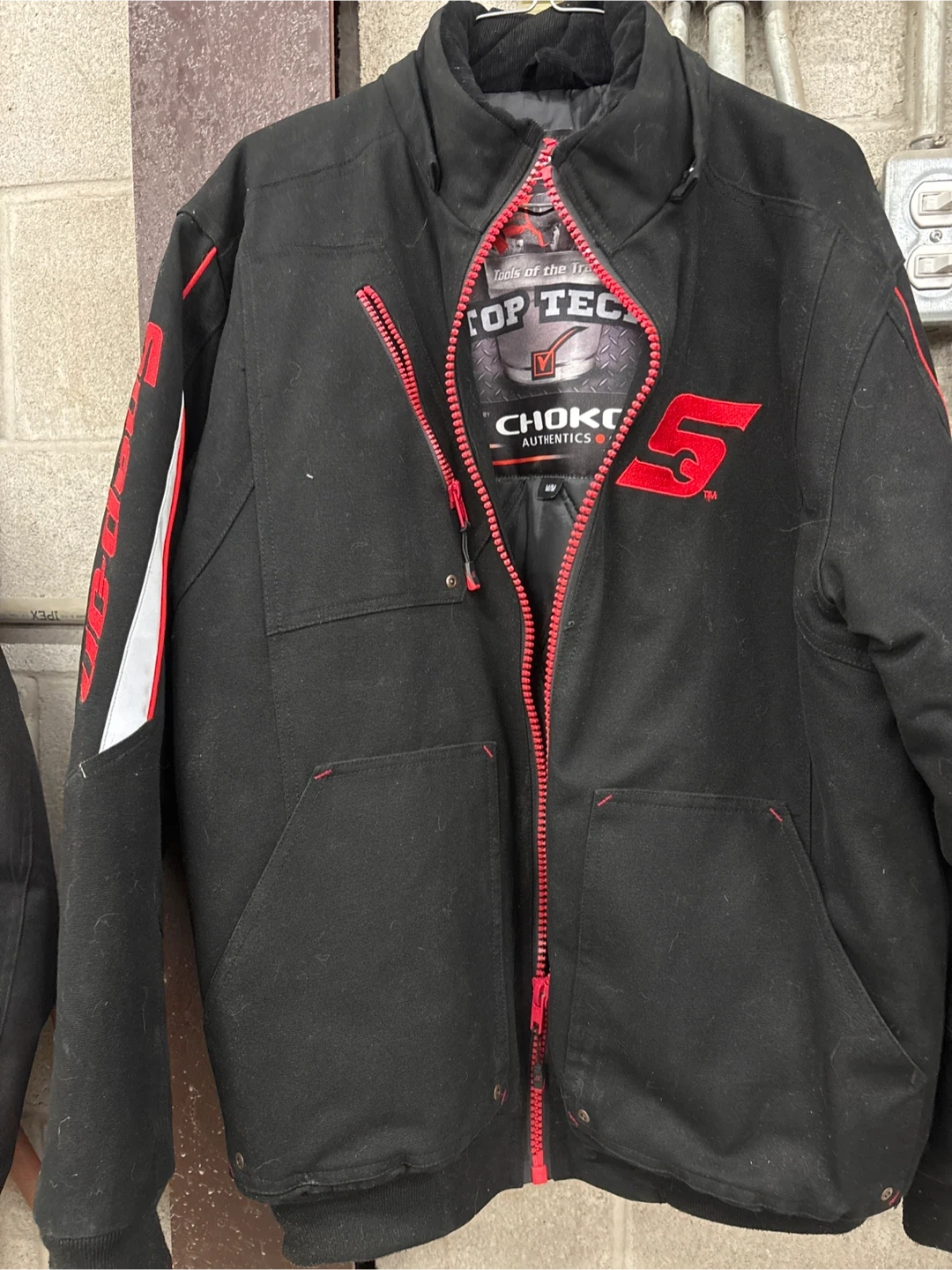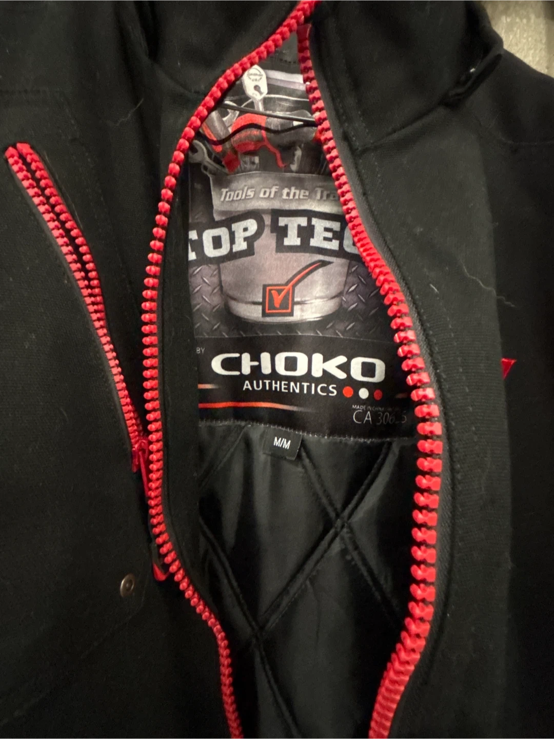 25Selling a Snap-on Choko Authentics jacket in size M/M. It's a stylish and durable jacket, perfect for cooler weather. Features a black exterior with red accents and a unique design. Size medium.