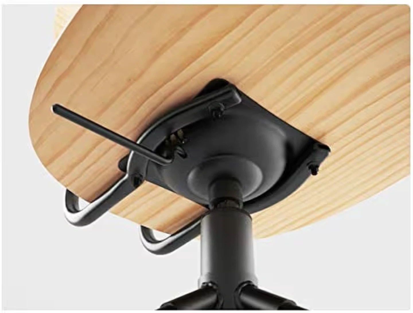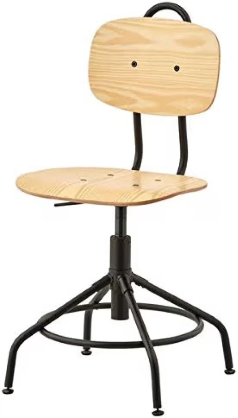 This IKEA swivel chair features a natural pine wood seat and back. It's height adjustable for personalized comfort. The base and frame are black metal.