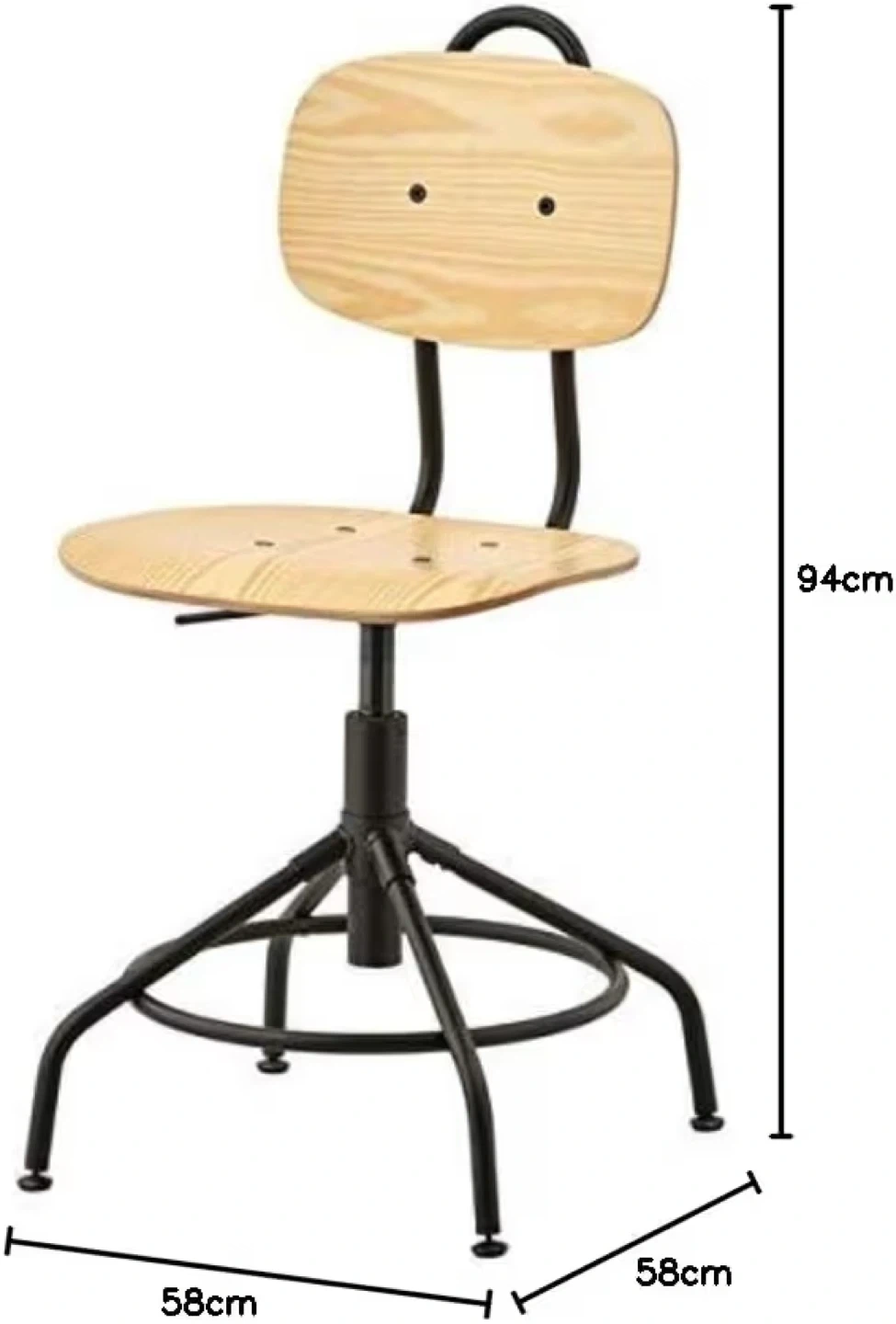 This IKEA swivel chair features a natural pine wood seat and back. It's height adjustable for personalized comfort. The base and frame are black metal.
