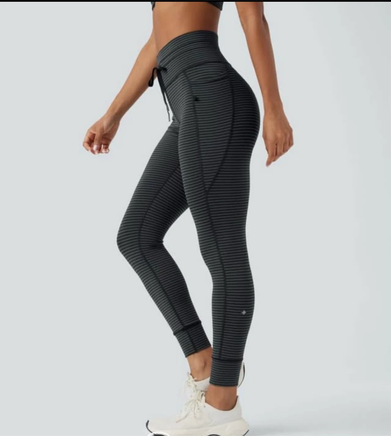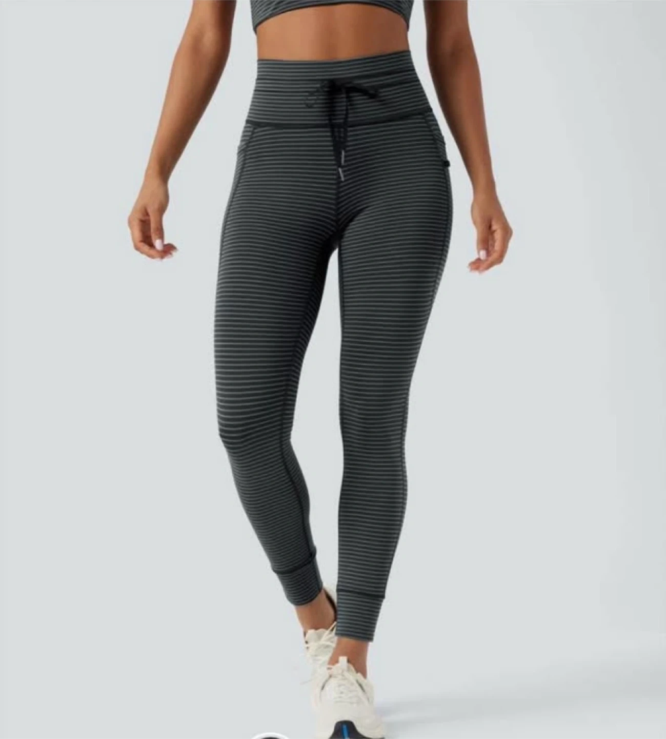 Halara leggings in a stylish striped pattern! These are size small and feature a comfortable drawstring waist and handy side pockets. Great for workouts or everyday wear!