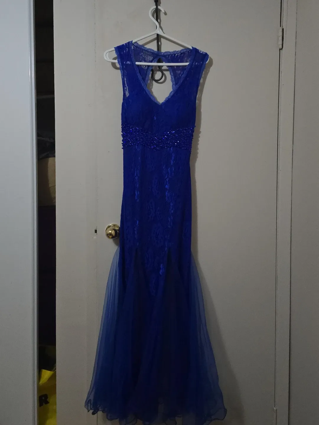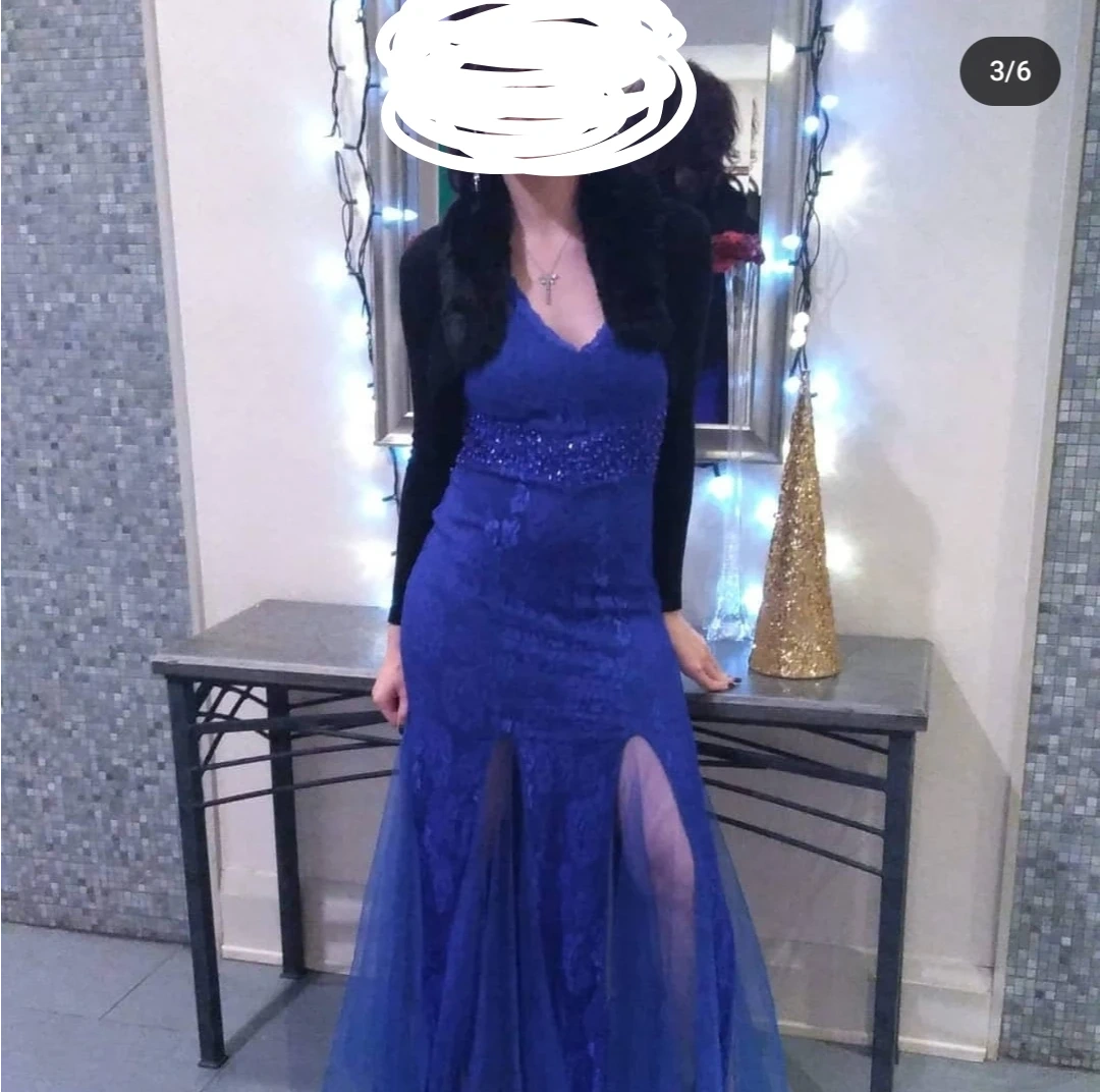 This royal blue evening gown features intricate lace detailing throughout. It has a V-neckline with beaded embellishments at the waist and a flowing tulle skirt and a keyhole style back. The side zipper works very well and the dress itself is very comfortable. Size Medium.