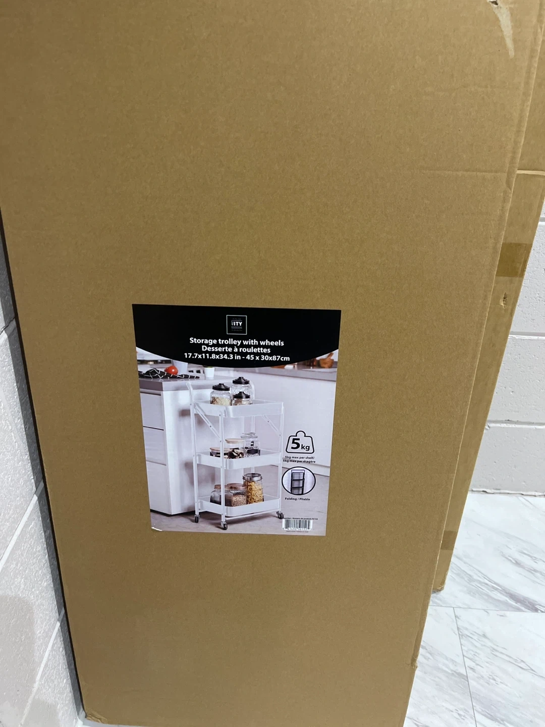 Selling a brand new VITY storage trolley with wheels, still in its original packaging! This handy cart measures 17.7x11.8x34.3 inches (45 x 30x87cm). It's foldable for easy storage and each shelf can hold up to 5kg