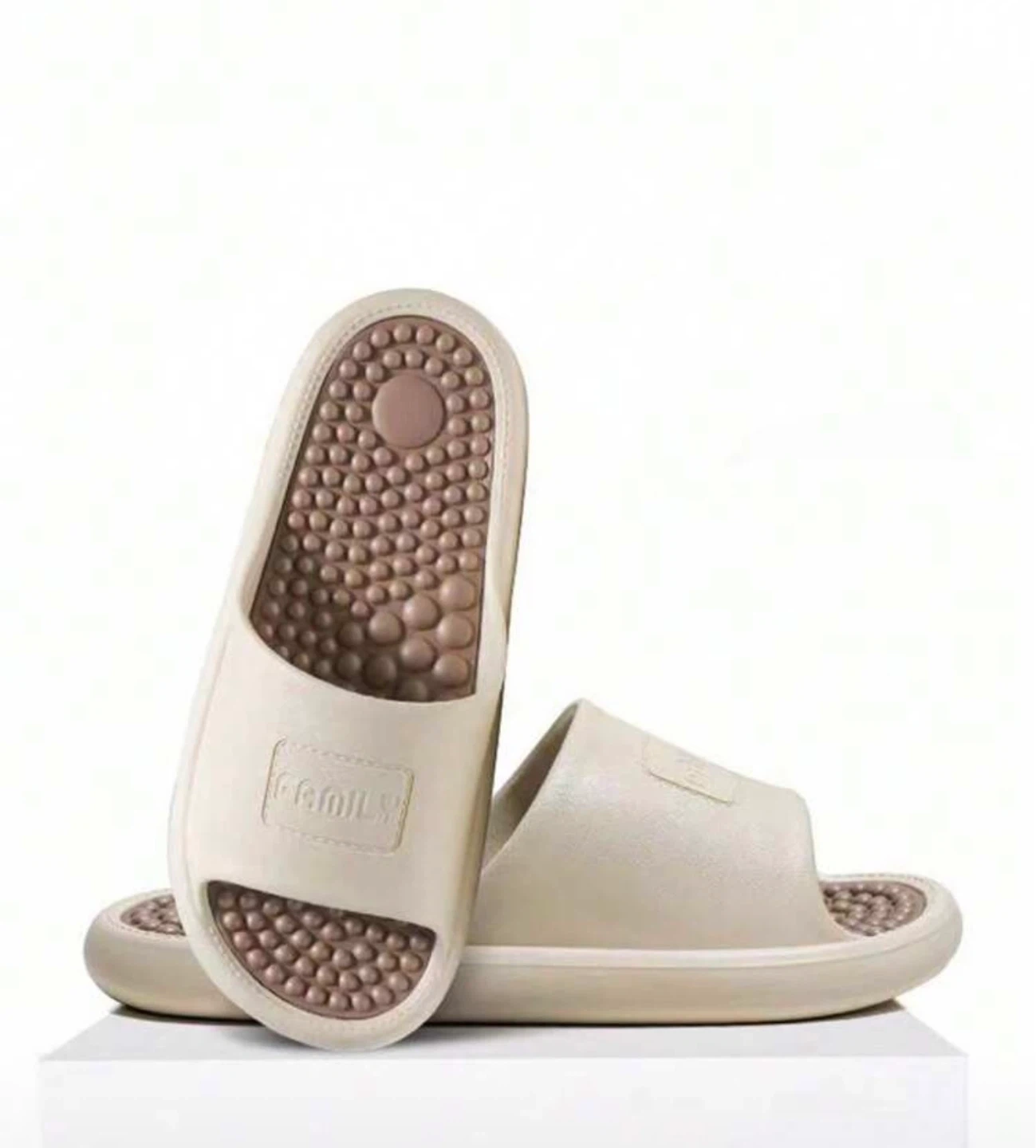 Cream-coloured slides with a textured massage sole. The brand name 'FAMILY' is embossed on the strap. These slides are made of a soft, comfortable material.