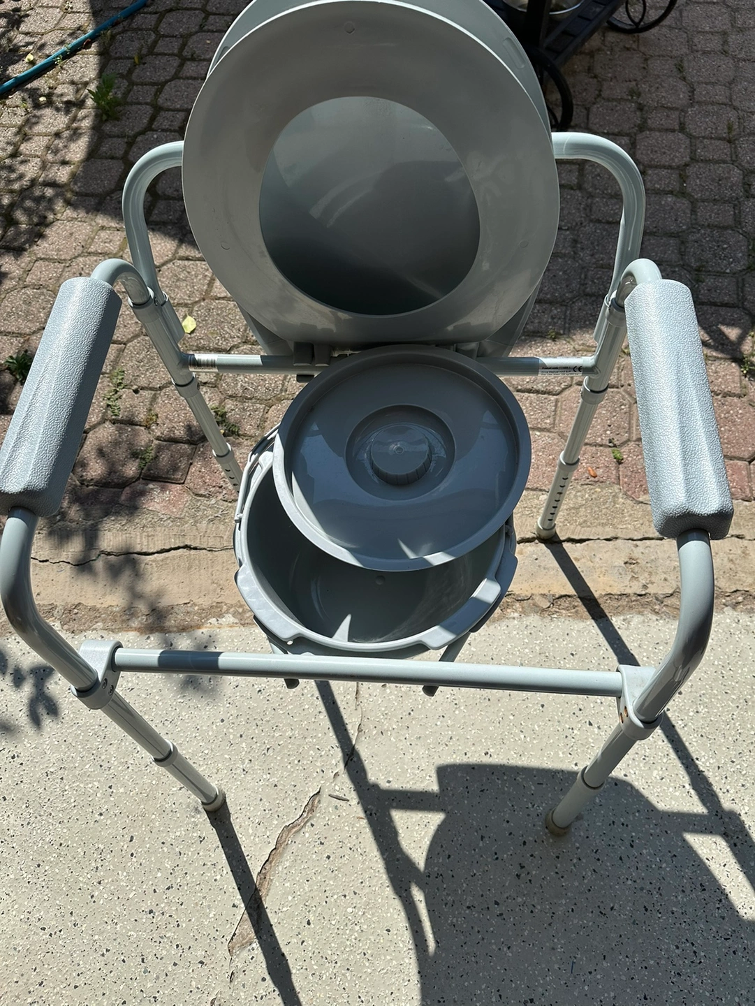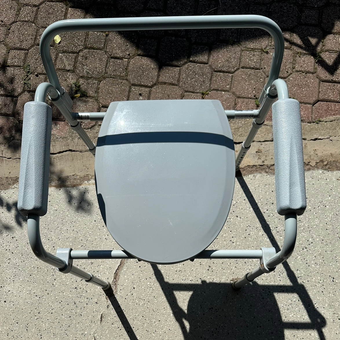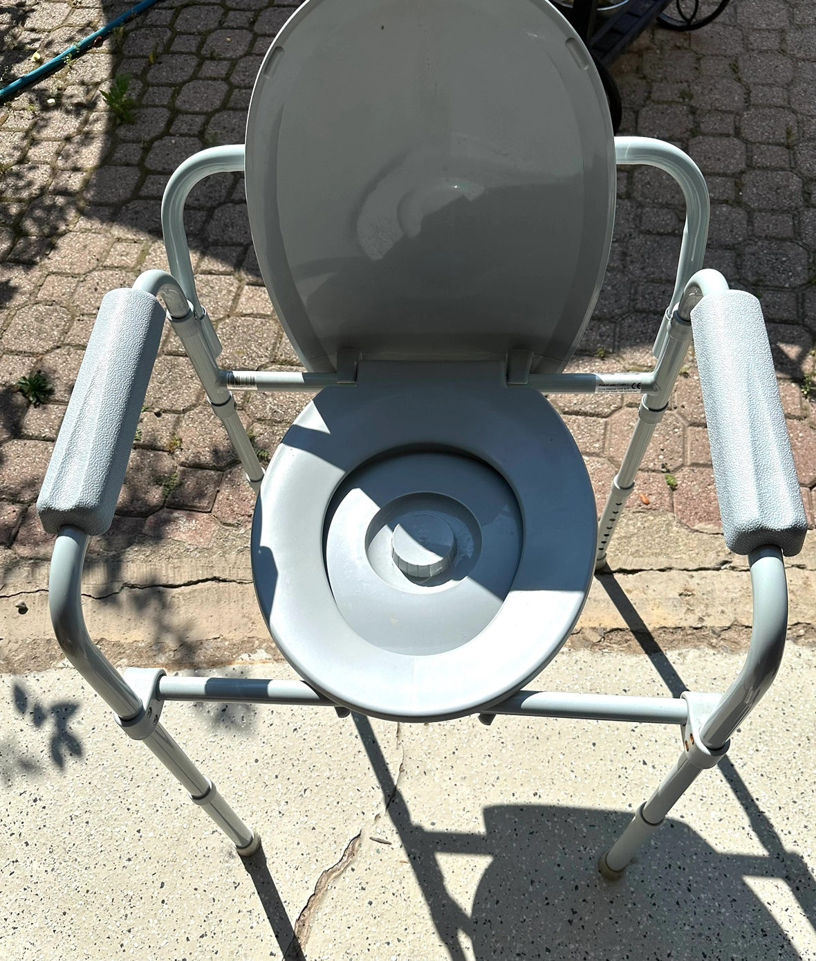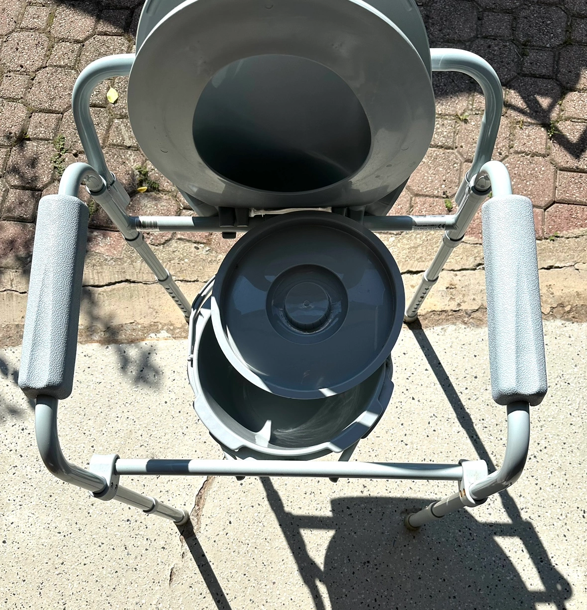 Grey portable toilet chair with arms and a removable bucket. Great for use in the home, by a bedside, or while travelling.