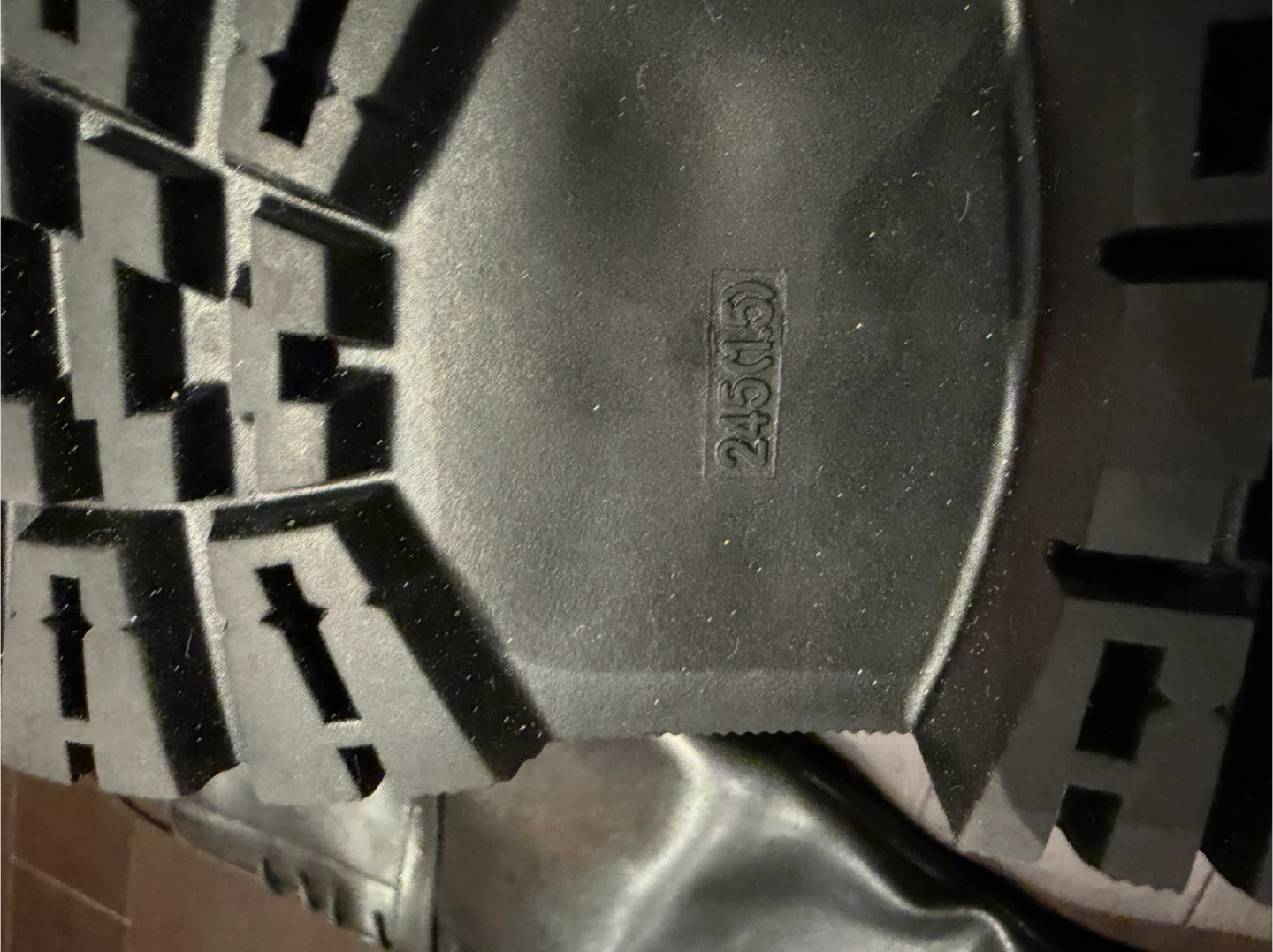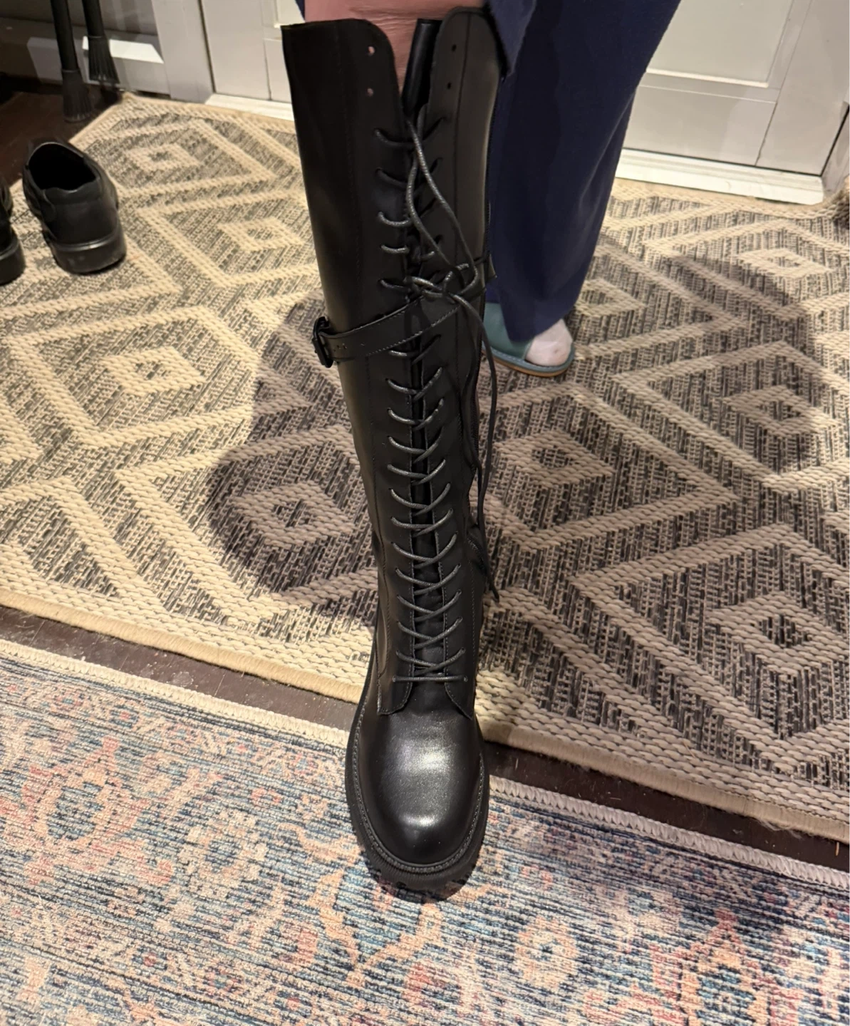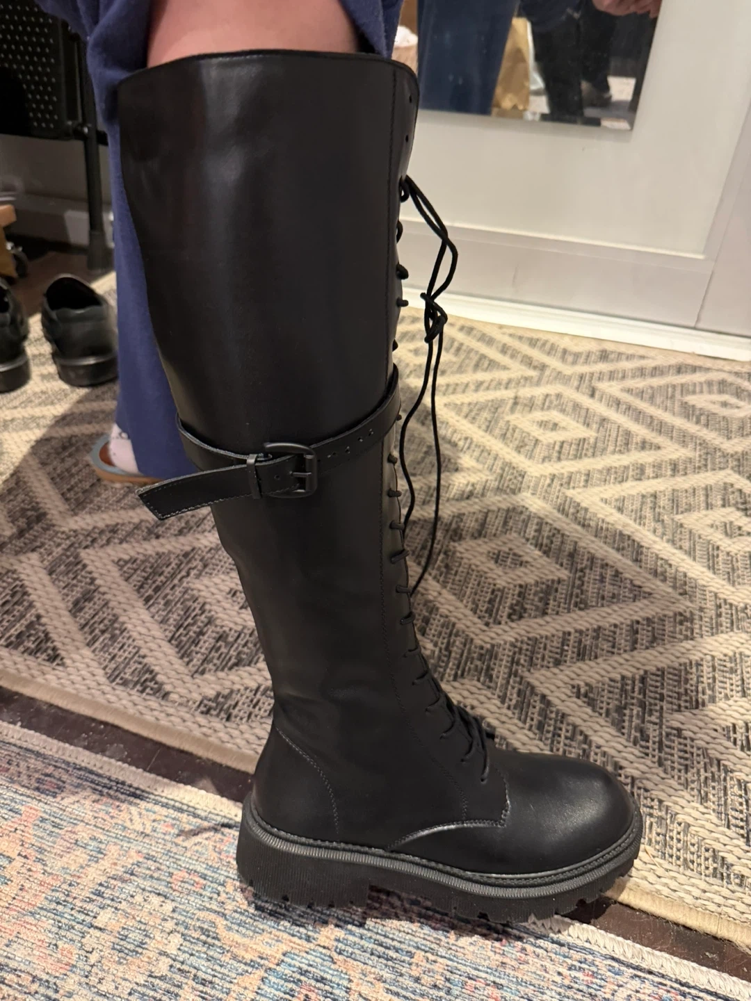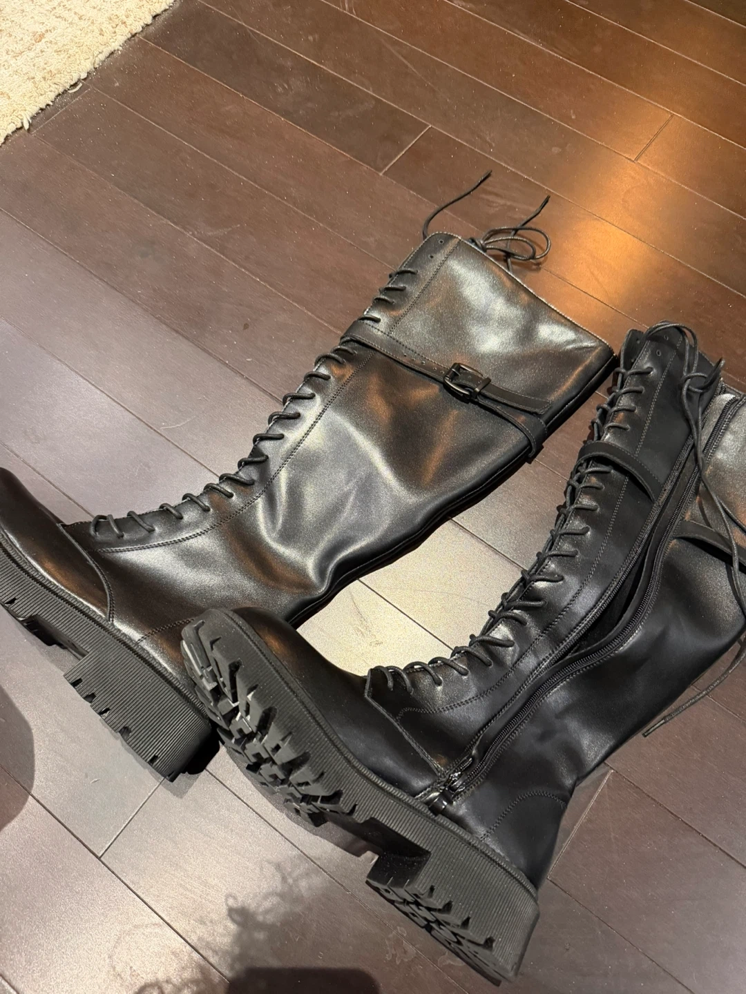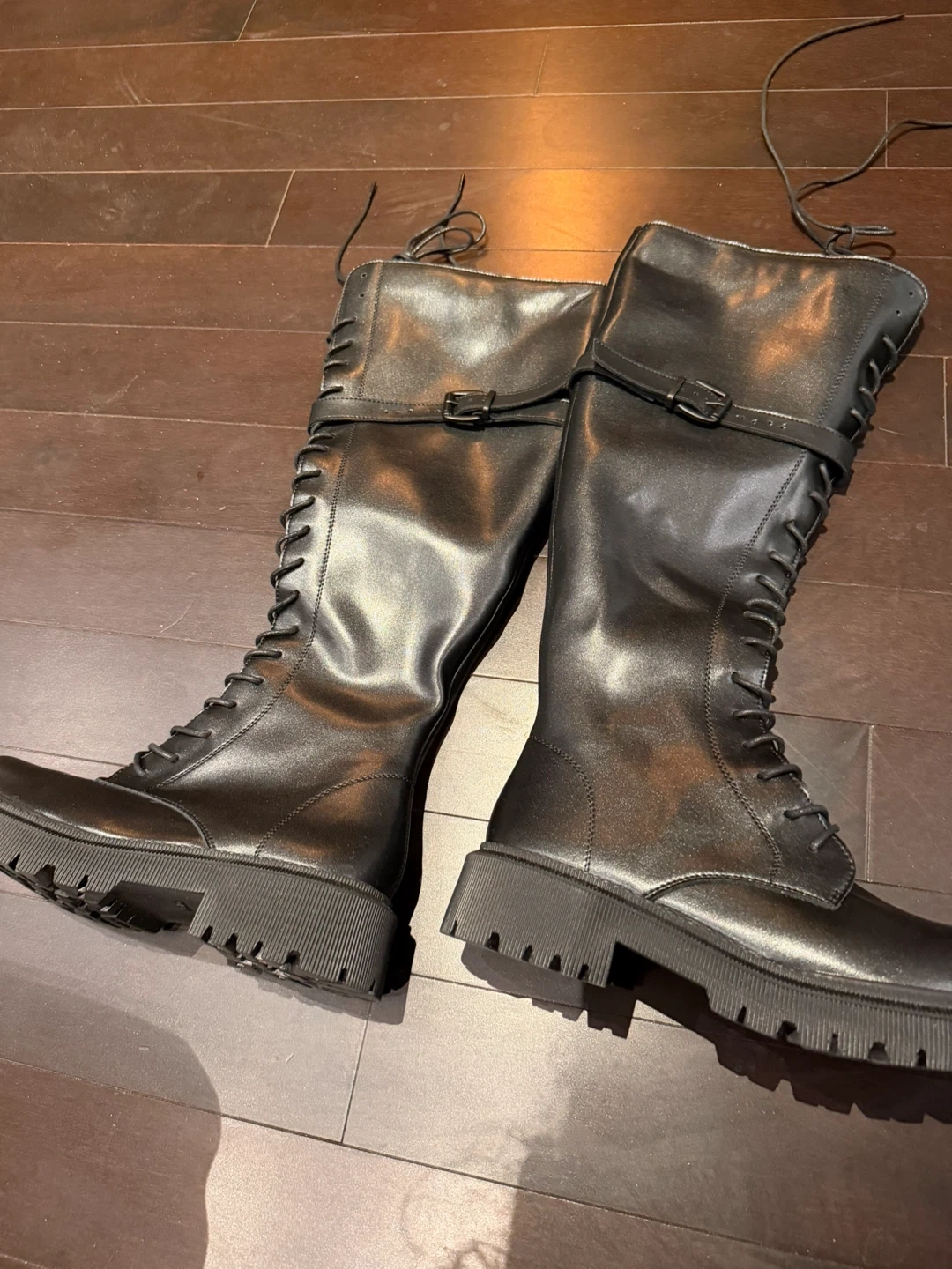 Selling a pair of stylish black lace-up knee-high boots. They're in great condition and ready for a new owner. The size is 245. These boots have a cool, edgy look with their lace-up design and chunky sole.