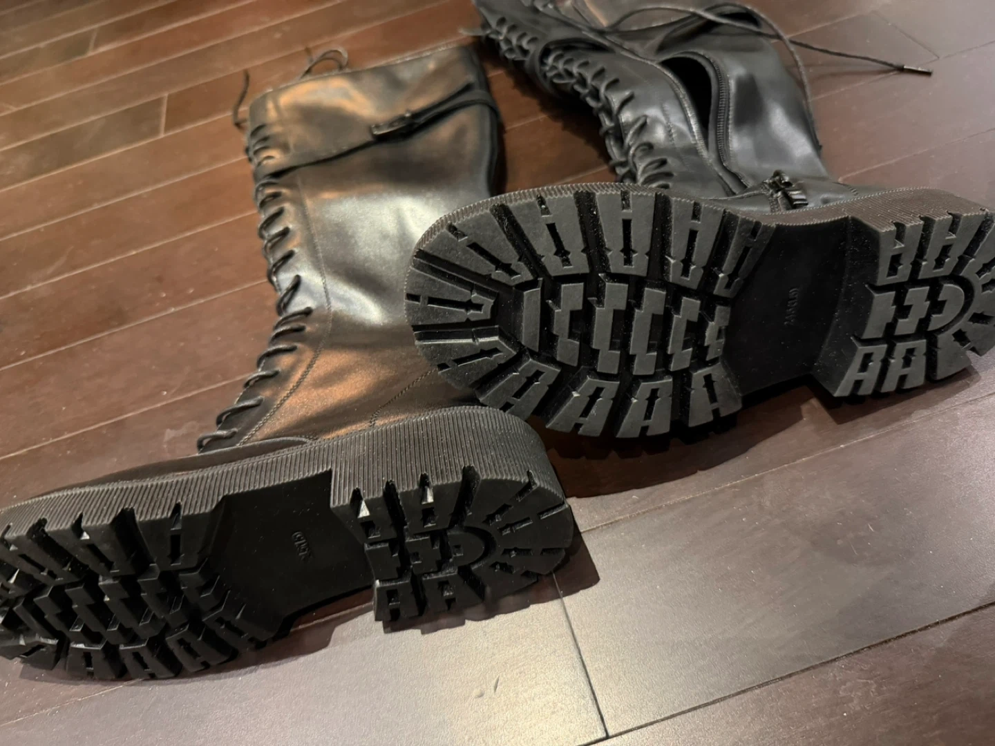 Selling a pair of stylish black lace-up knee-high boots. They're in great condition and ready for a new owner. The size is 245. These boots have a cool, edgy look with their lace-up design and chunky sole.