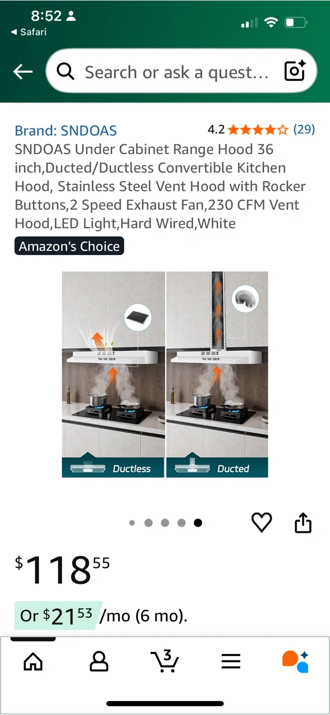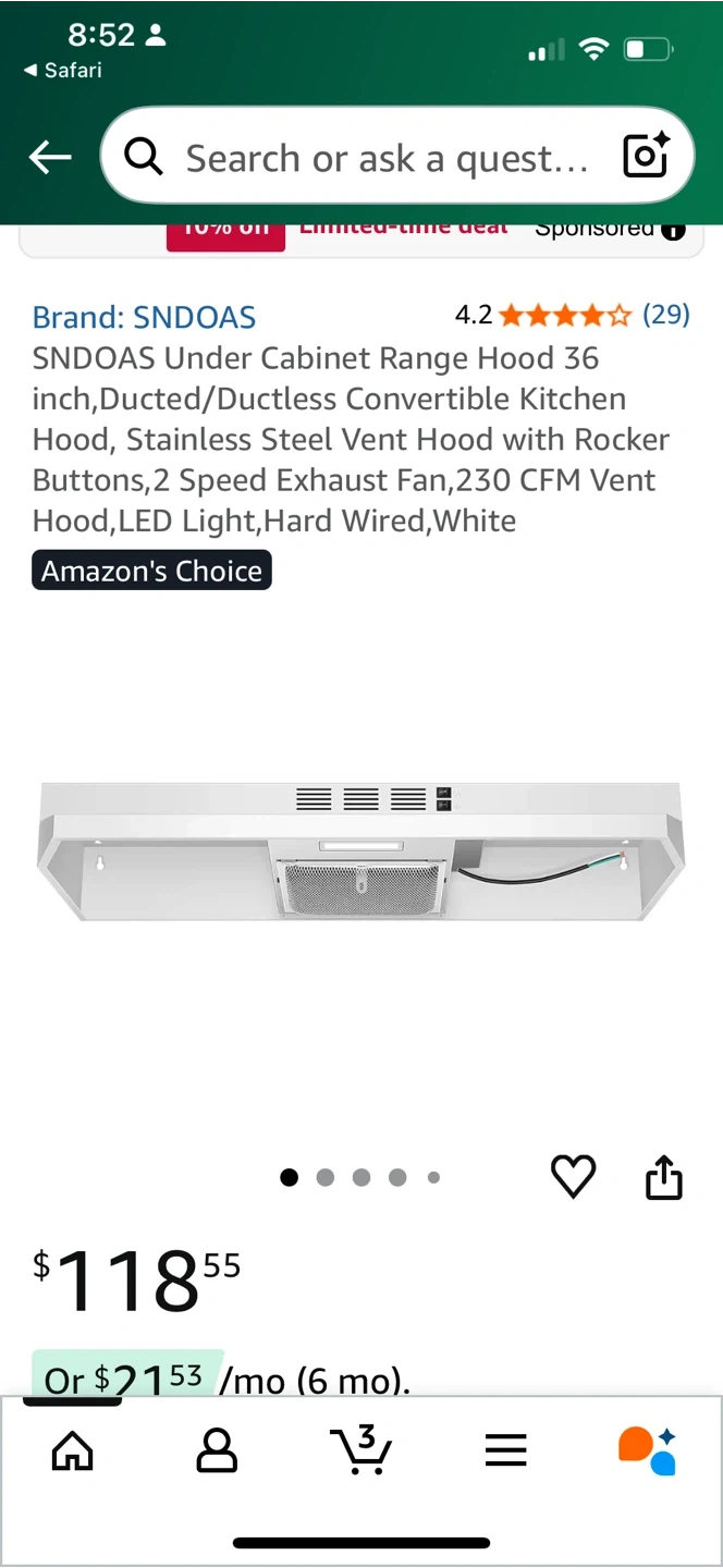 60Selling a SNDOAS under cabinet range hood, 36 inches. It's a ducted/ductless convertible kitchen hood with stainless steel vent, rocker buttons, a 2-speed exhaust fan, 230 CFM vent hood, LED light, and is hard wired. Originally bought for $118.55