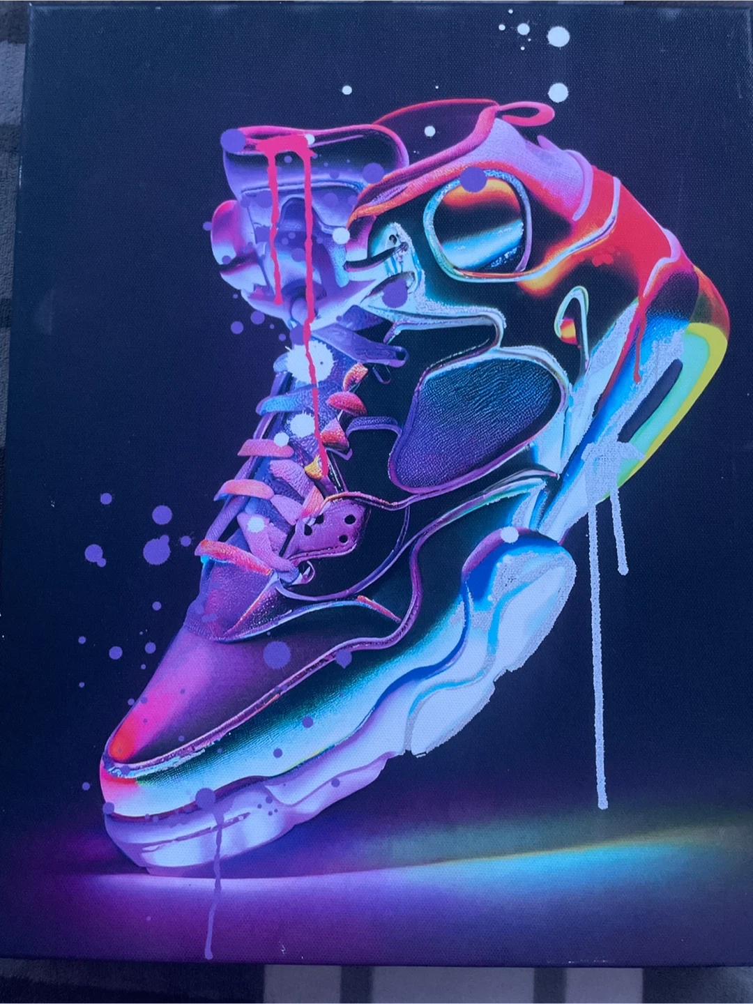 Here's a cool piece of art featuring a sneaker with vibrant, neon colours. It would look great on any wall! If you have any questions please send me a message I’m free to negotiating!