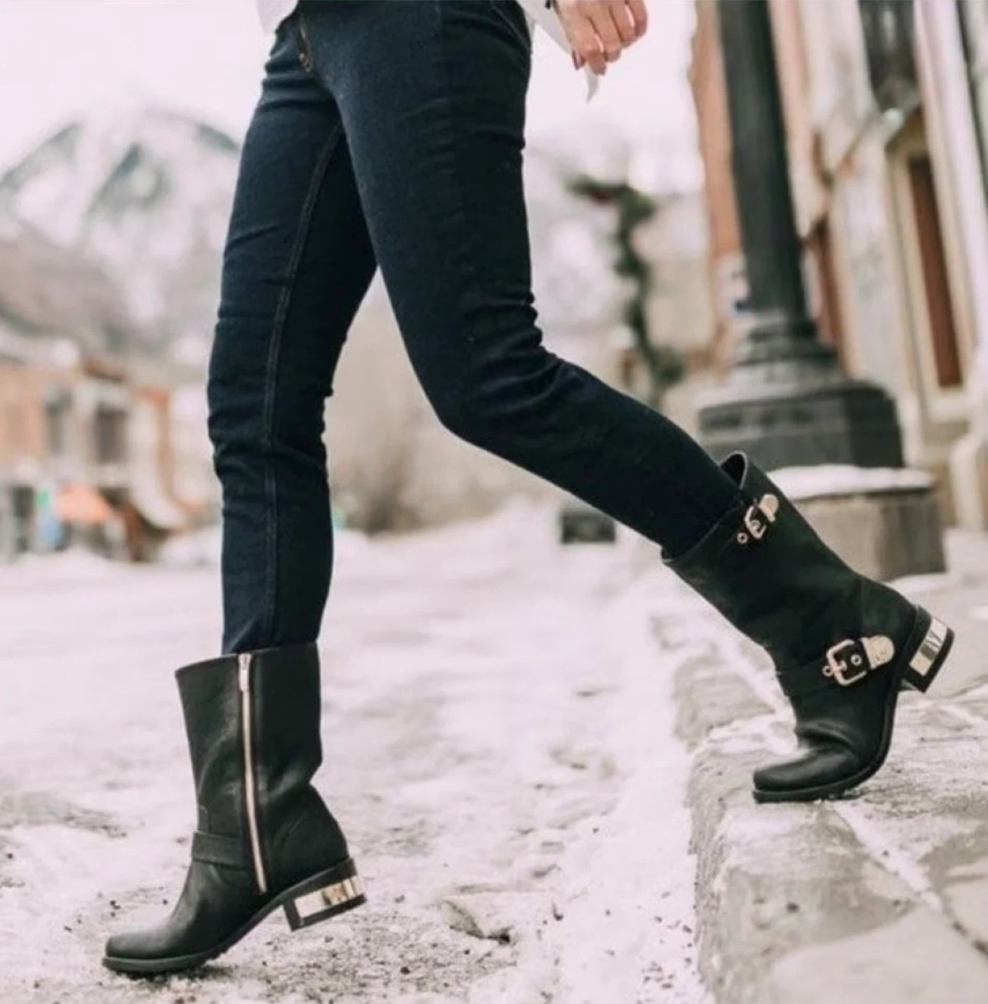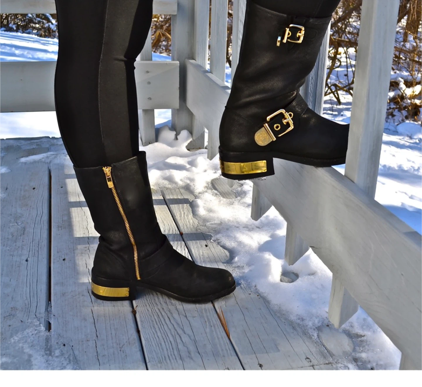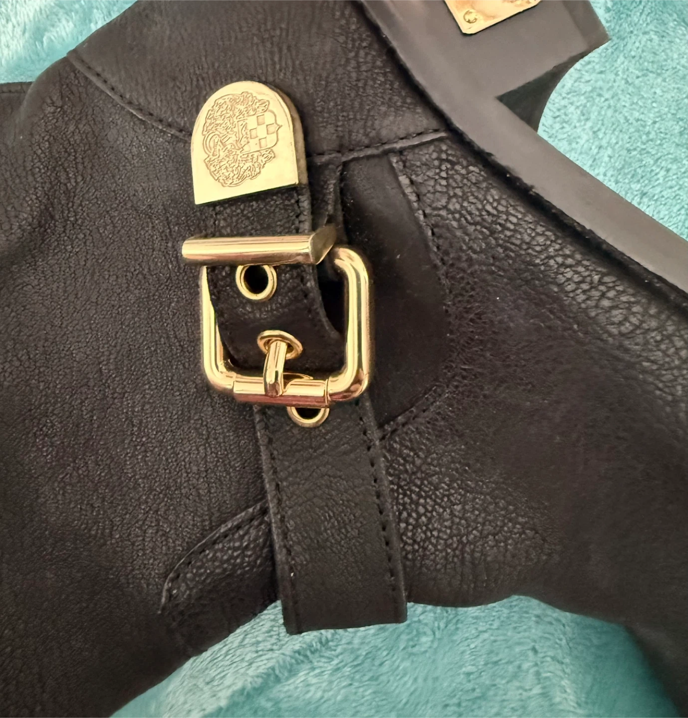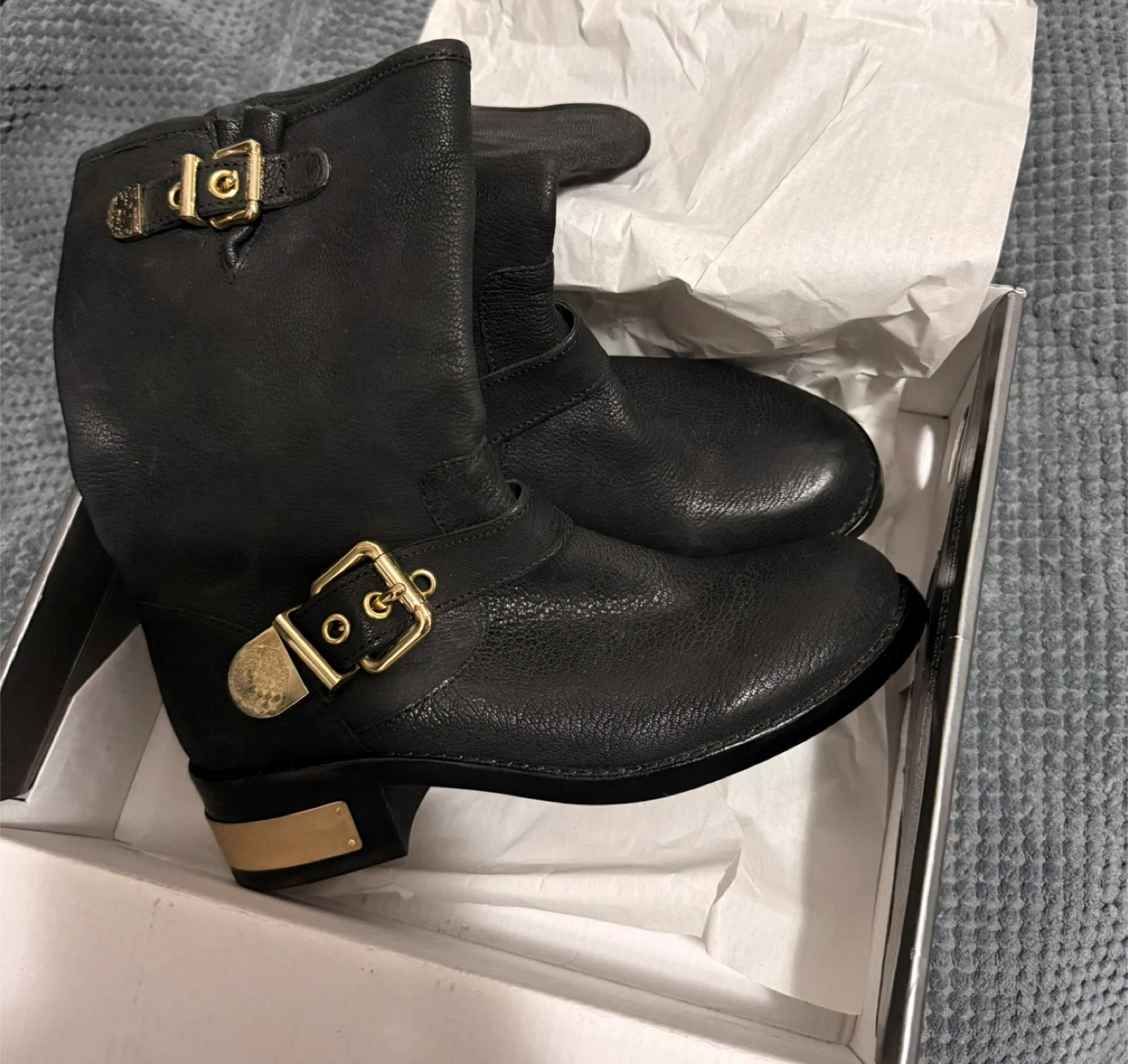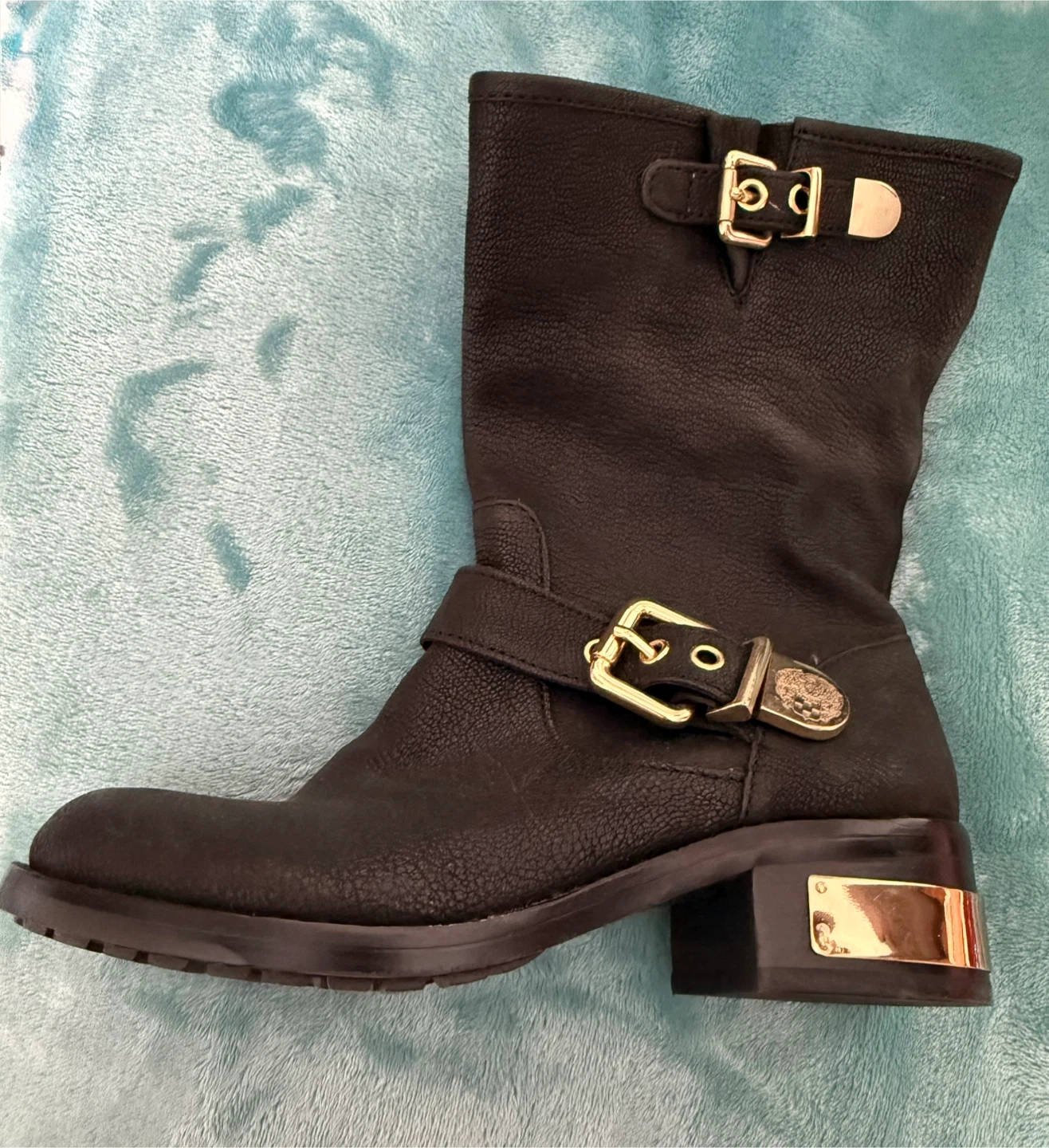 These Vince Camuto boots are made from black leather. They feature gold-tone buckles, zippers, details and a block heel.