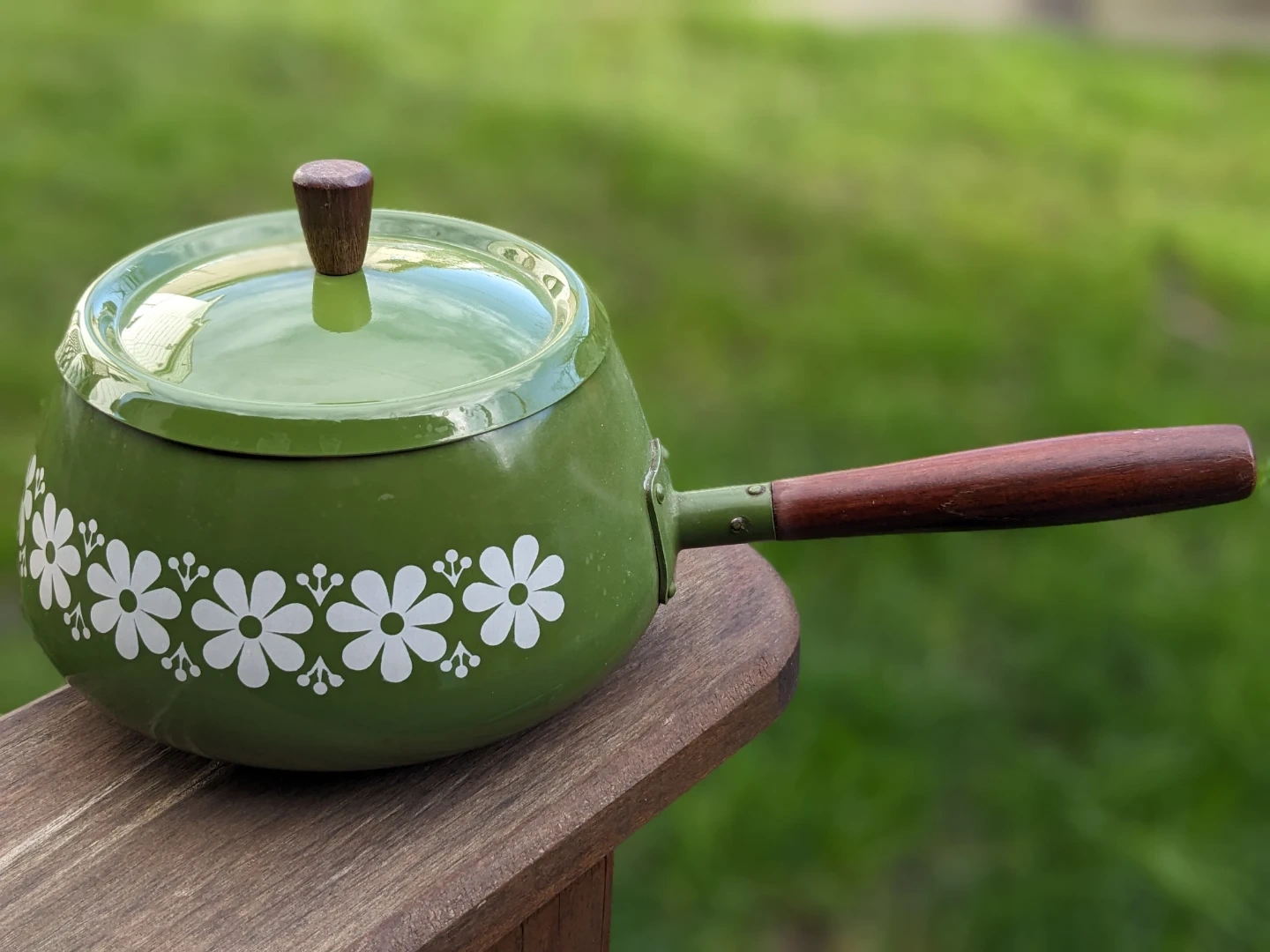 A charming vintage green enamelware saucepan featuring a retro daisy pattern. It has a durable aluminum interior and a wooden handle. This pot is perfect for making sauces or heating small portions.