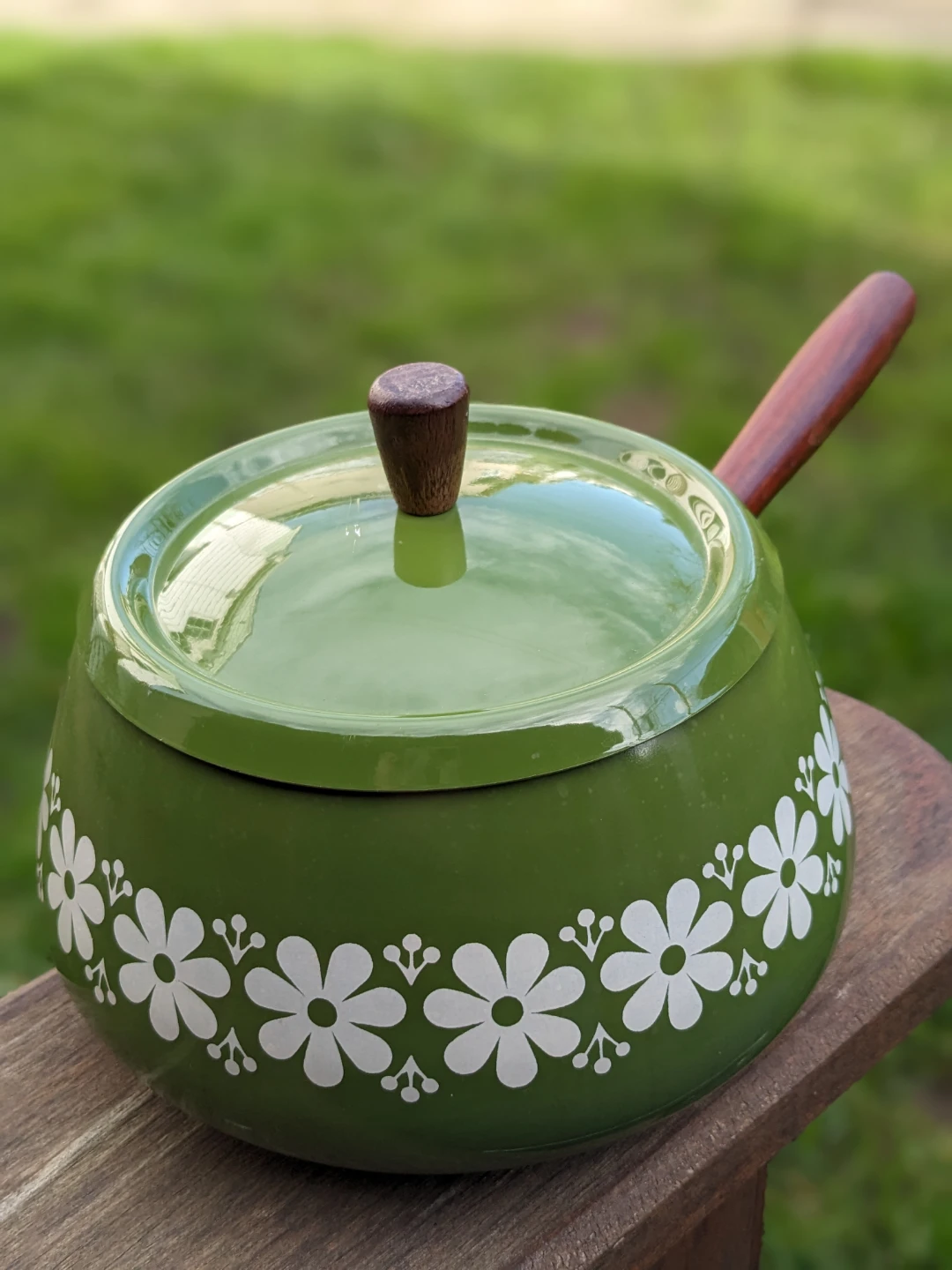 A charming vintage green enamelware saucepan featuring a retro daisy pattern. It has a durable aluminum interior and a wooden handle. This pot is perfect for making sauces or heating small portions.