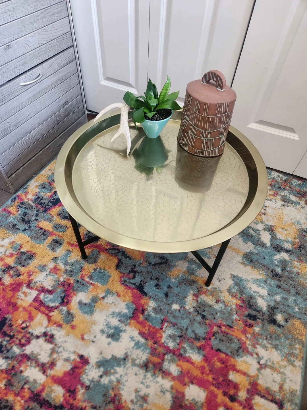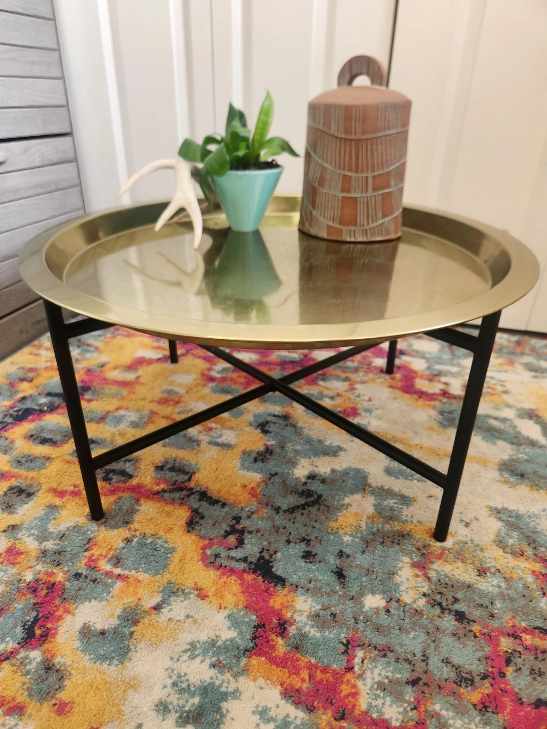 This LIKE NEW round IKEA coffee table features a gold-tone REMOVABLE tray top with an embossed floral-like pattern. It's supported by black metal legs with an X-brace design. It's a stylish accent piece for your living room!