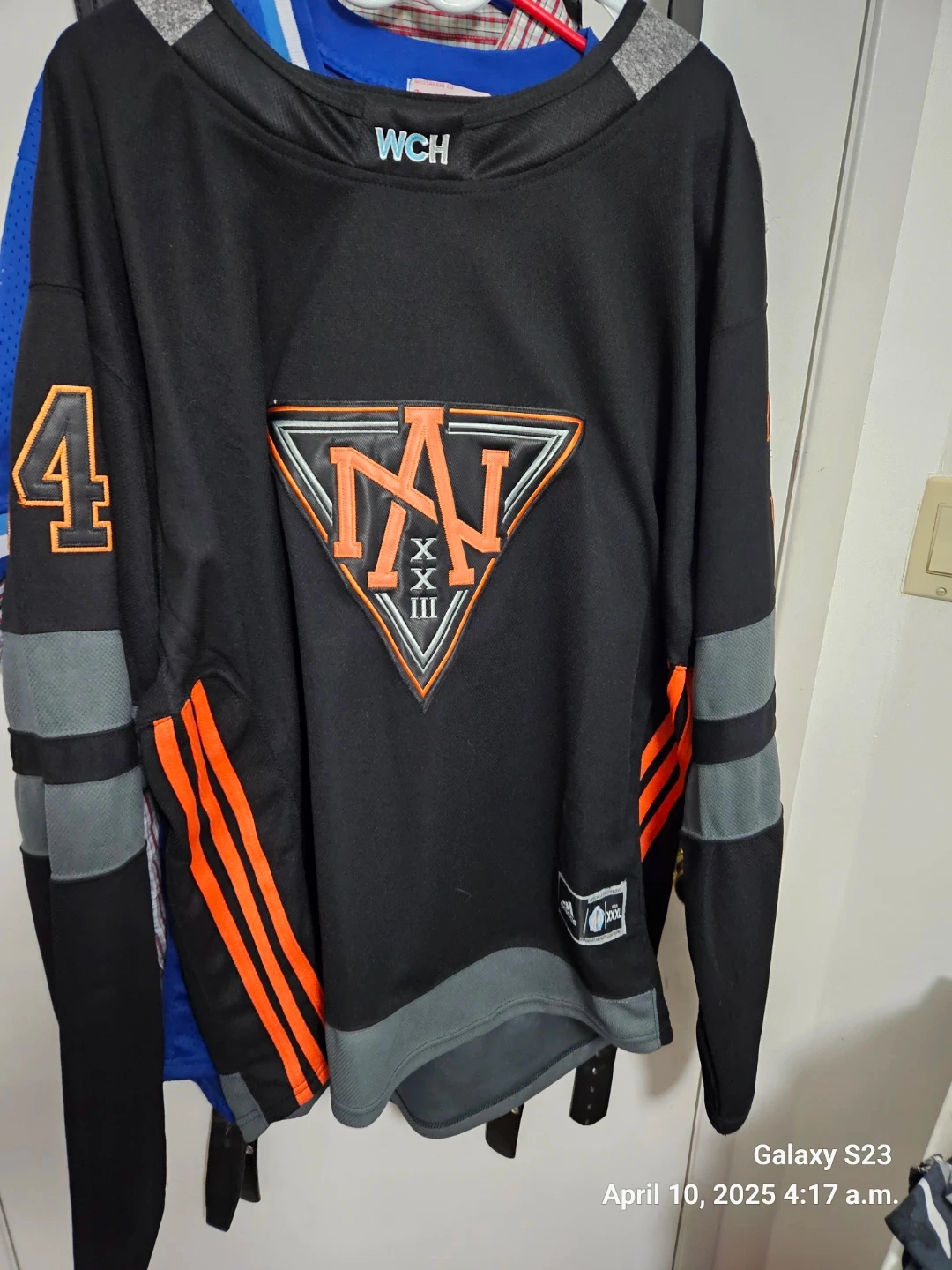 This is an Adidas hockey jersey for Auston Matthews, number 34, of the Toronto Maple Leafs. It's a black jersey with orange and grey accents. Made by Adidas.