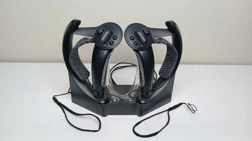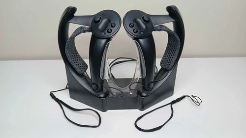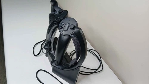 For sale is a genuine Valve Index controller set, including both left and right controllers along with an AMVR charging dock and wall/table mount. The controllers have some cosmetic scuffs but buttons, thumbsticks, and tracking sensors are intact with no drift. Charging ports are clean and functional. This is a great replacement or upgrade set for an existing Valve Index setup.