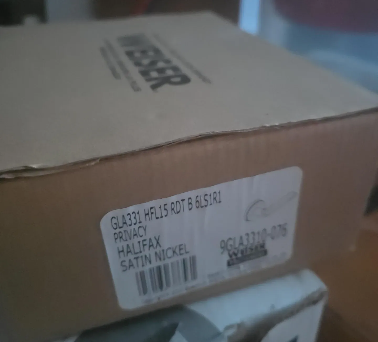 This is a Weiser Halifax privacy lock set in satin nickel. It's designed for interior doors. Installation hardware is included in the box. Brand new never used