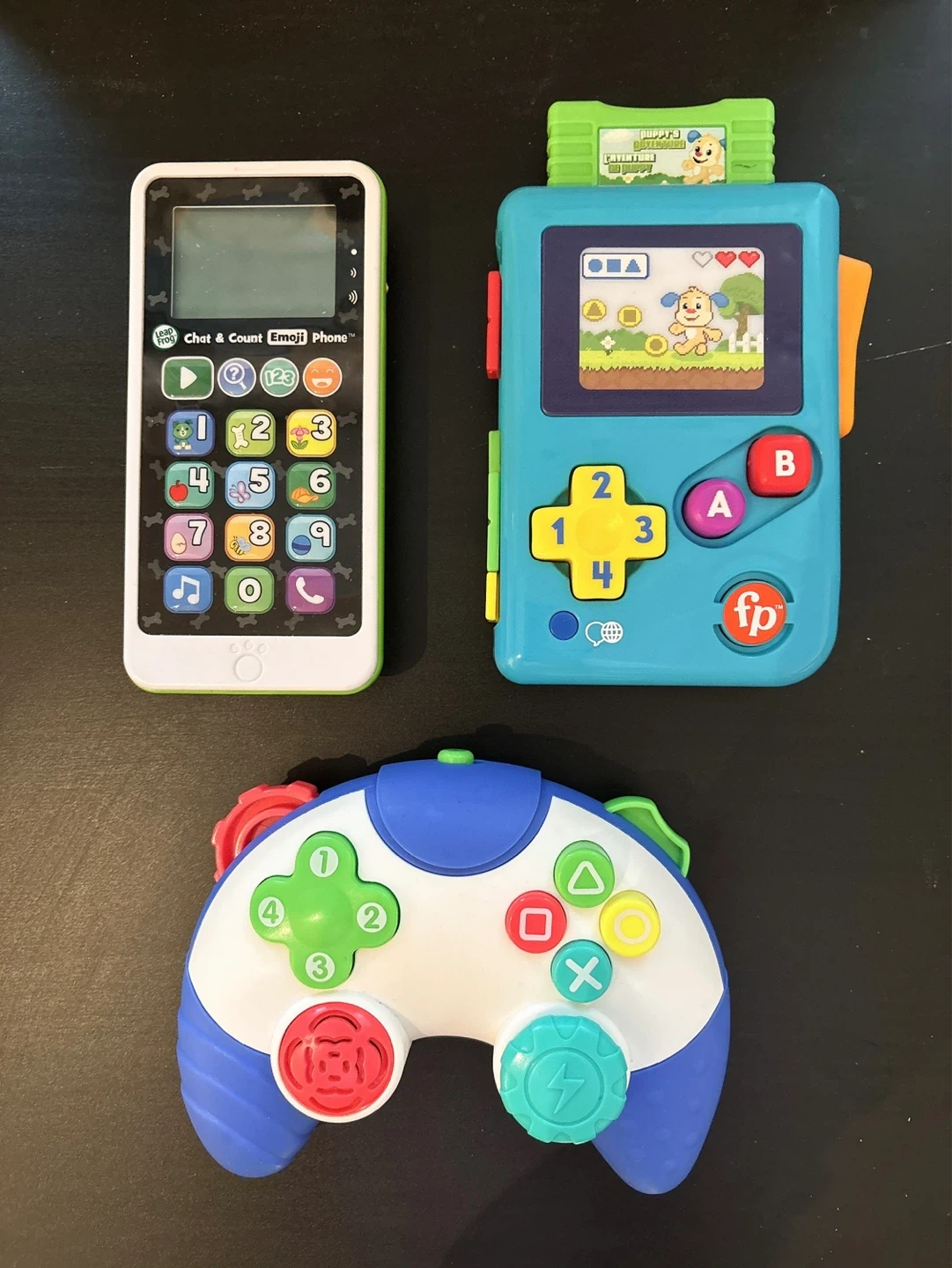 This bundle includes a LeapFrog Chat & Count Emoji Phone and a Fisher-Price toy gaming device with a controller. The phone features number and emoji buttons, while the gaming device has a screen and colourful buttons. Great for interactive play!