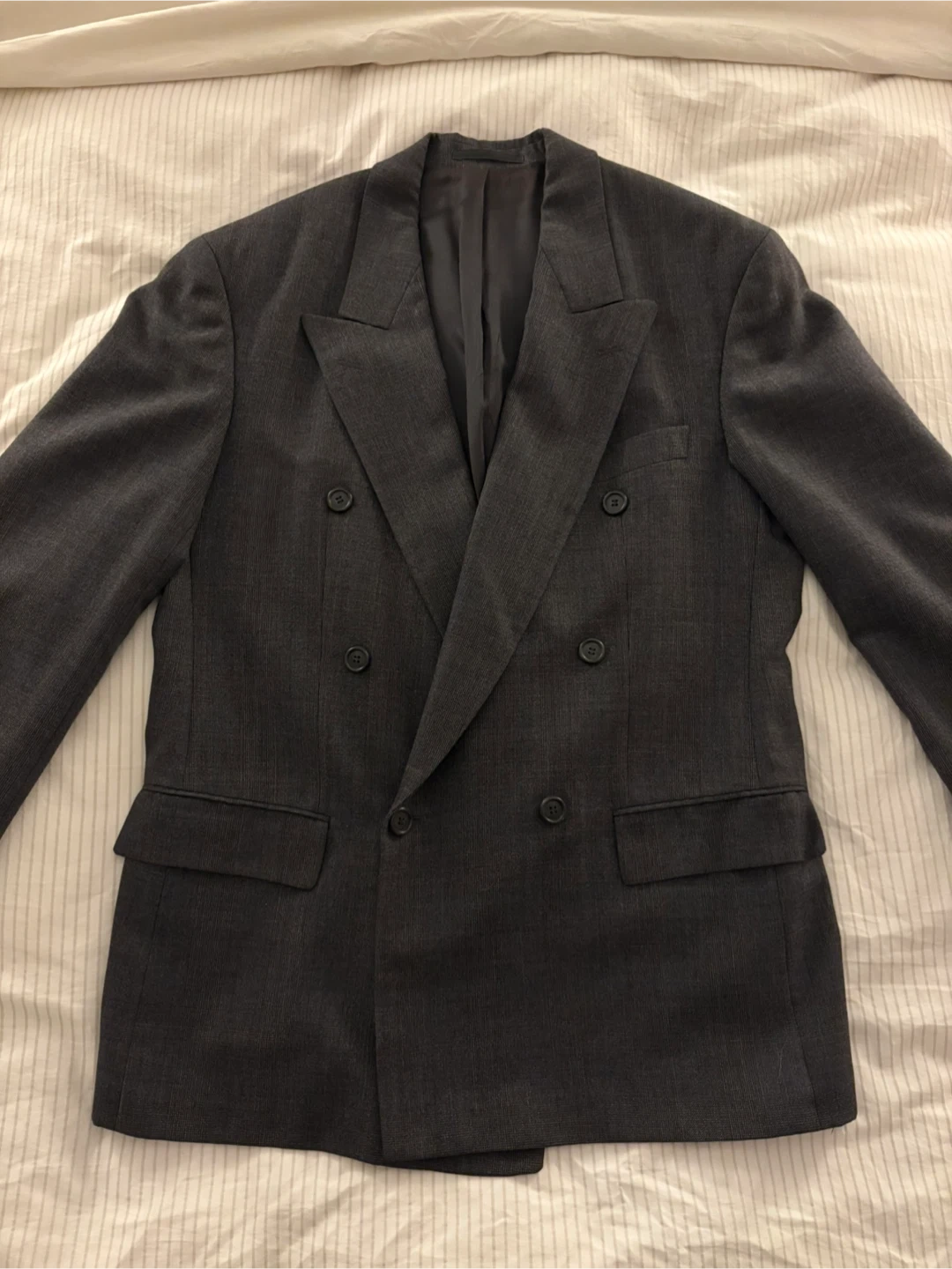 A sharp BOSS Hugo Boss men's blazer. It's a dark grey, double-breasted style with a notched lapel. This jacket features four front buttons and two chest pockets.