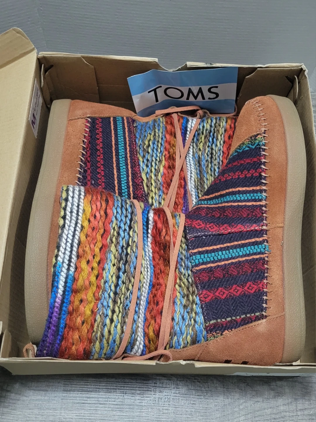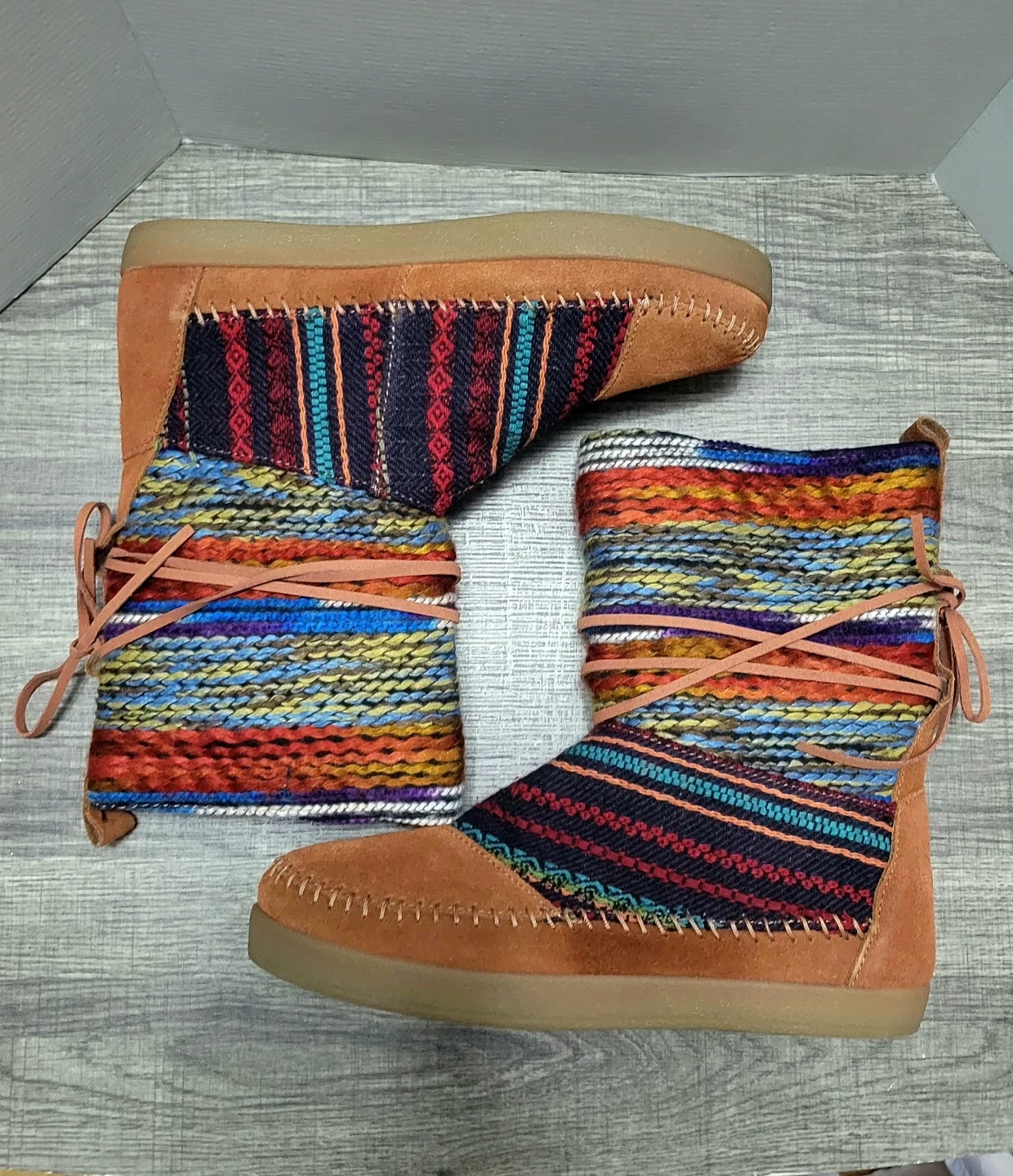 These TOMS Avalon booties feature a colorful woven fabric shaft with suede accents. They come in a size 7.5 and include the original box. Perfect for adding a pop of color to your fall and winter outfits!
