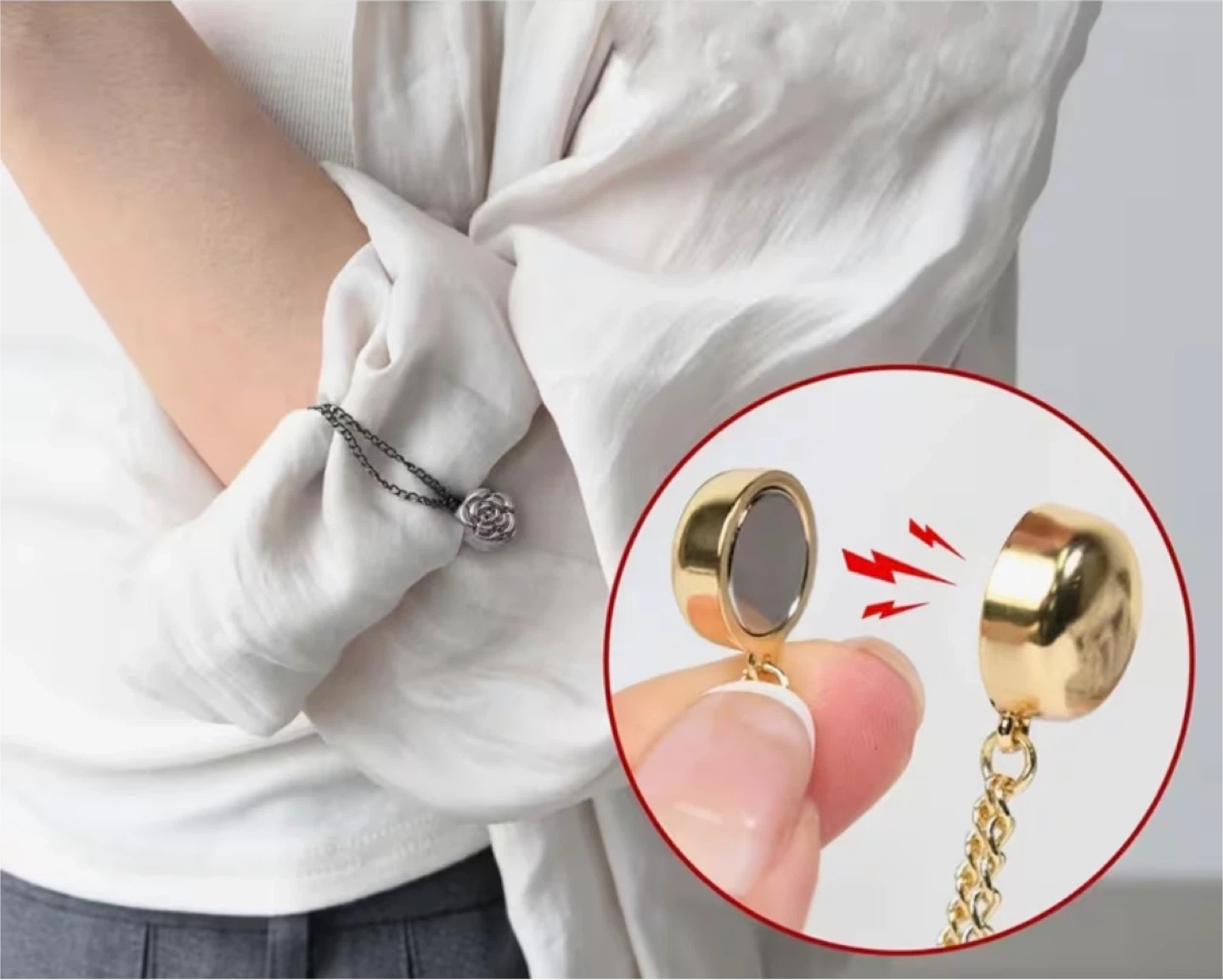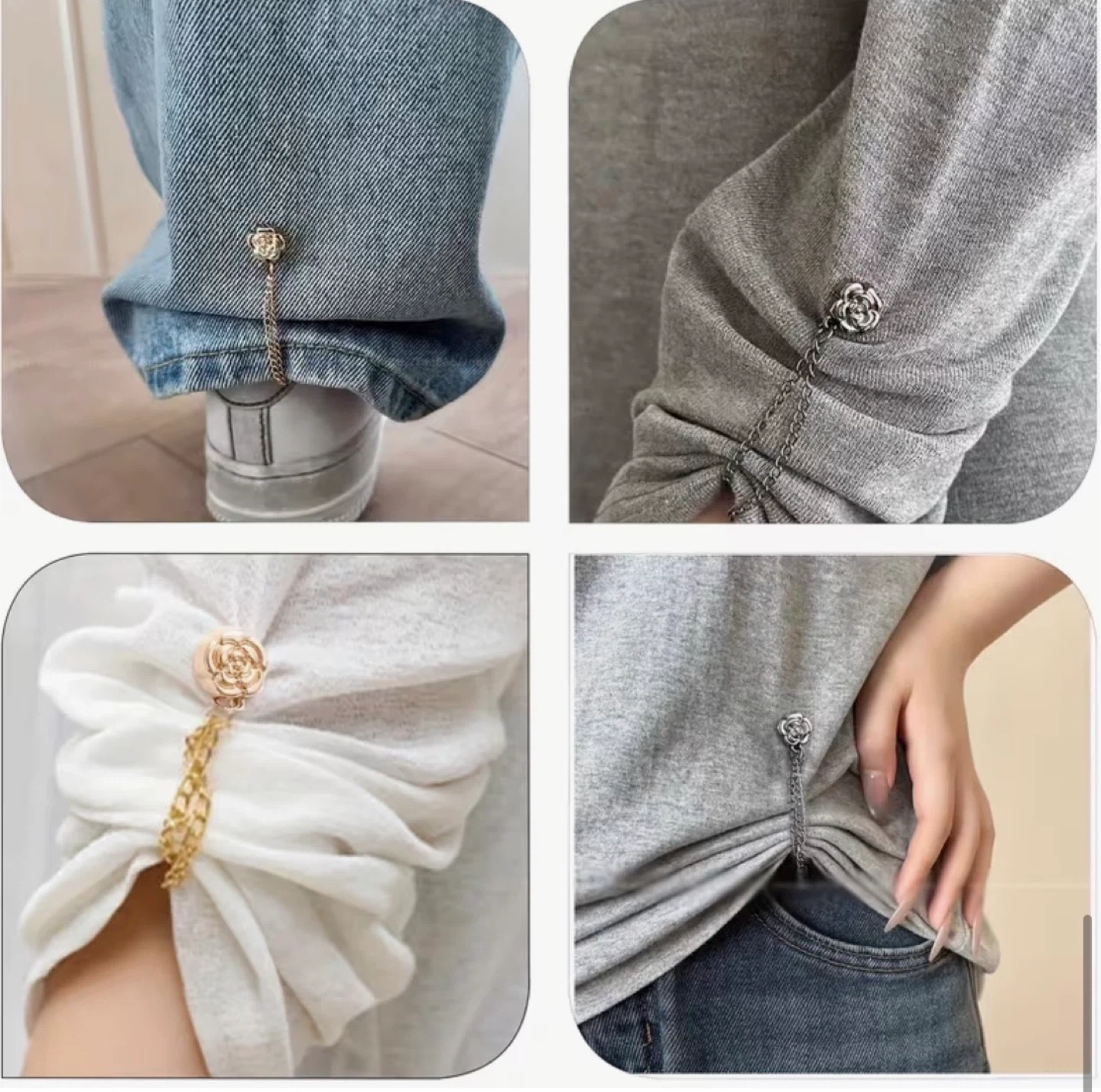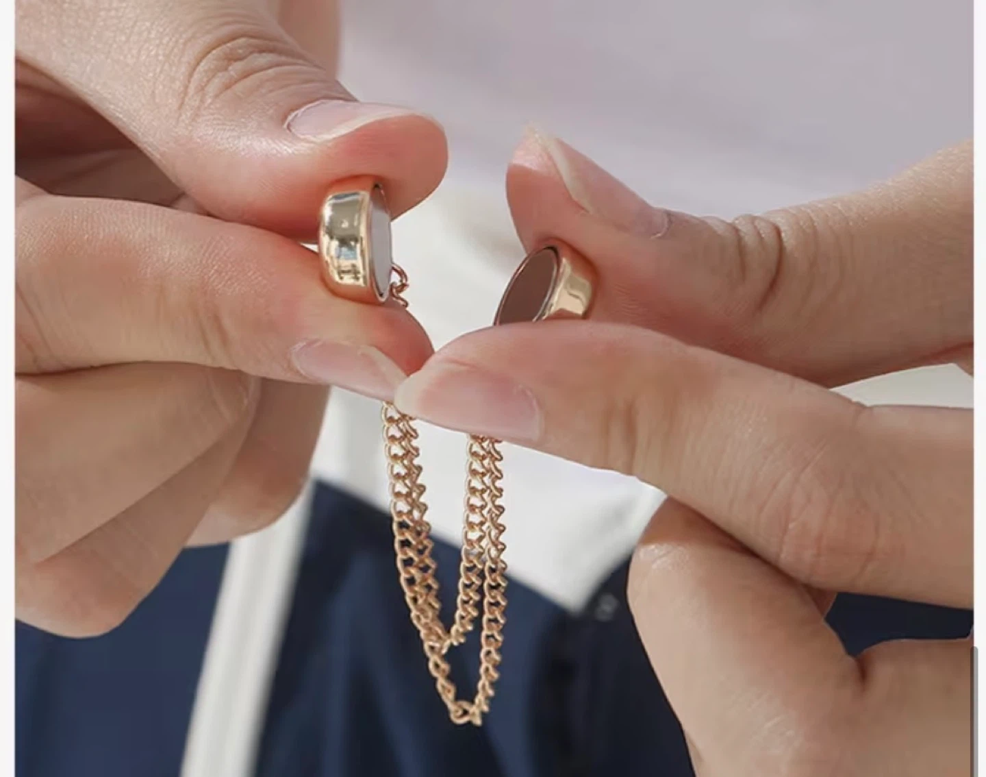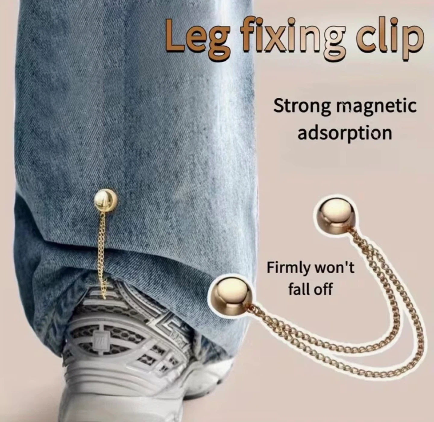 This is a magnetic clip with a double chain. It's designed to help shorten sleeves or cinch pant legs. Strong magnetic adsorption ensures it won't fall off!