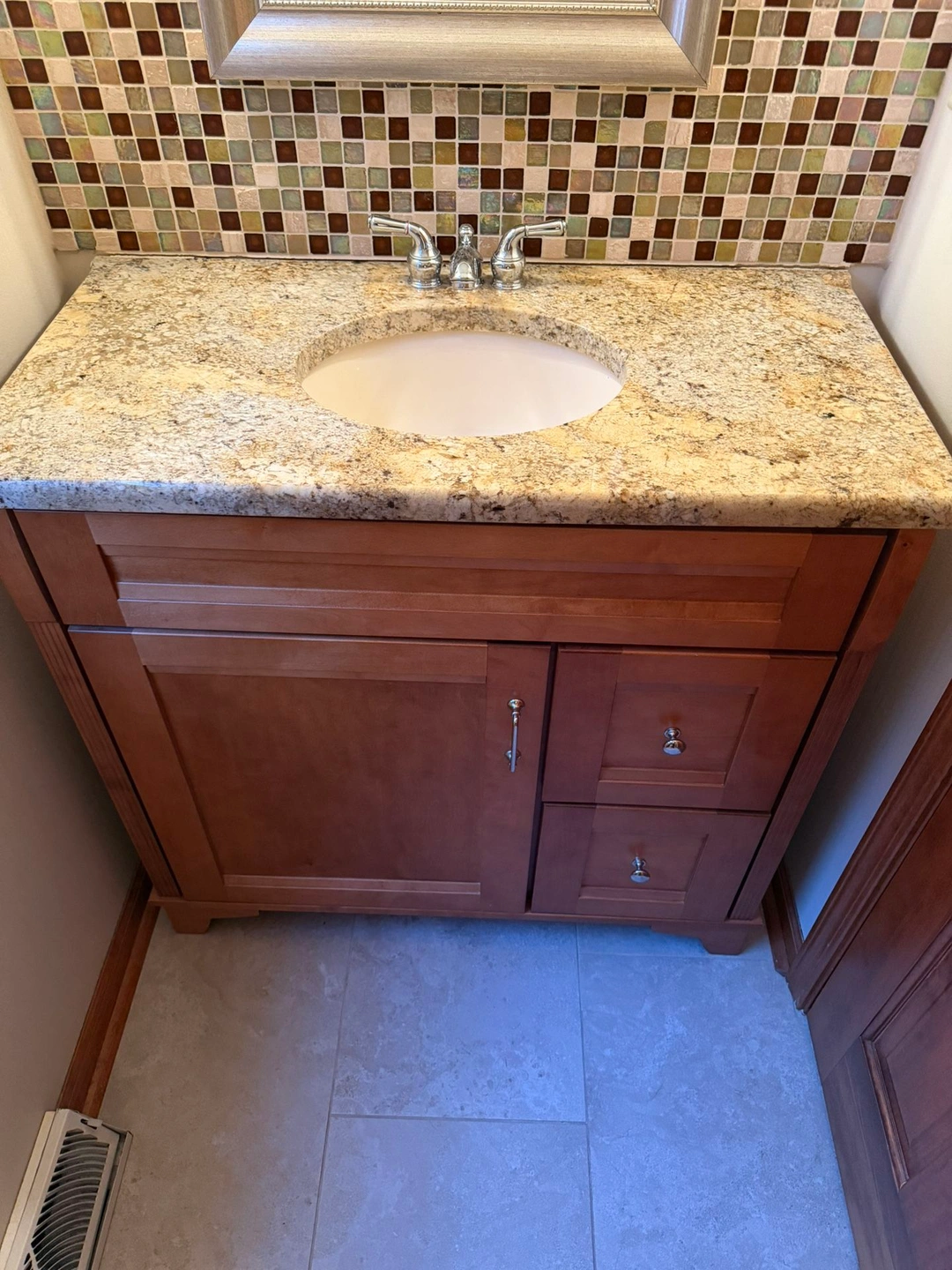 Solid maple vanity, 19.5” deep, 37.75” wide, 36” high with soft-close drawers. Great condition. Real 1.25” granite vanity top. Faucet and 2 sconce lights included. Mirror is 21.5” x 38.5” high.