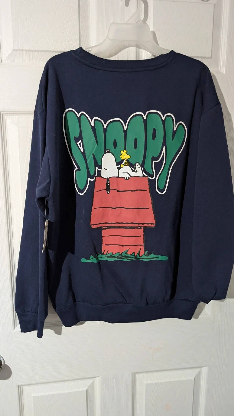 18Selling a cute Snoopy crewneck sweater in size large! It's a navy blue colour with a graphic of Snoopy and the Peanuts gang on the front, and Snoopy's name and him on his dog house on the back. It's in great condition!