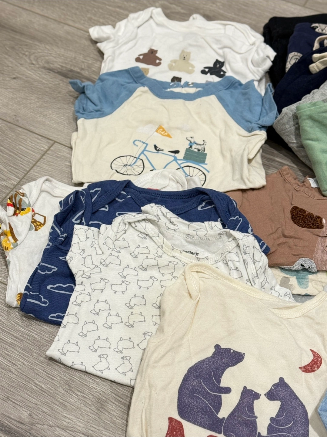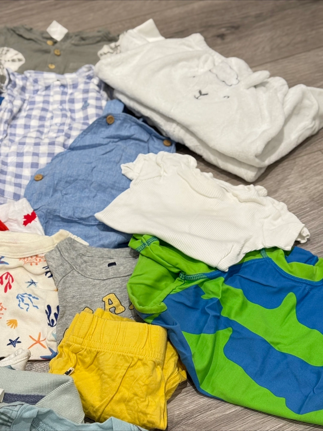 Selling as a set. 2 gap tshirt onesies. 9 cottons pants (baby gap, carters, old navy), 3 Zara long sleeve shirts, 2 baby gap shirt and short sets, 4 stand alone shorts (old navy, carters), 5 rococo tshirt onesies, H&M tie dye romper, baby gap checkered romper, H&M shirt and jumper set, carters thick cotton sweater and jogger set (sheep design), George shorts romper swimsuit, 4 tshirts (H&M, baby gap, carters, Zara), 2 tshirt onesie and pant set, , 1 old navy Tanktop, 1 old navy Tanktop onesie, 1 old navy long sleeve onesie, 3 tshirt onesies (old navy, carters). Comes from smoke free/pet free home. Pick up only Forty First Street/Lakeshore Etobicoke Cash only.