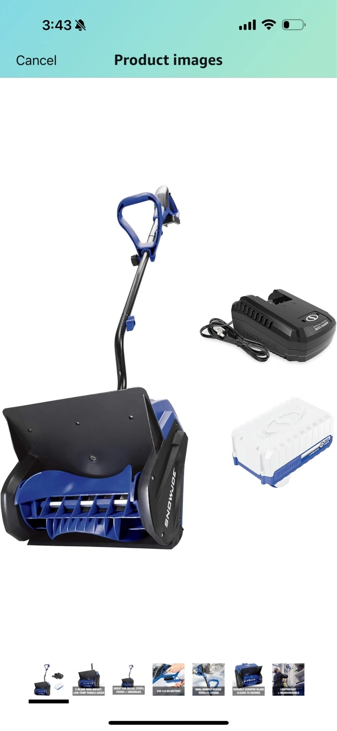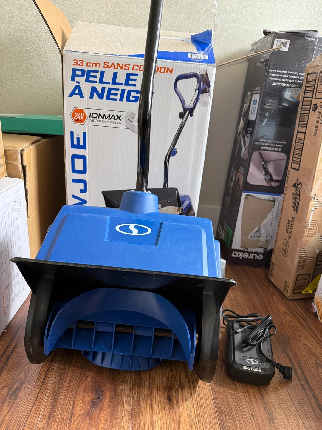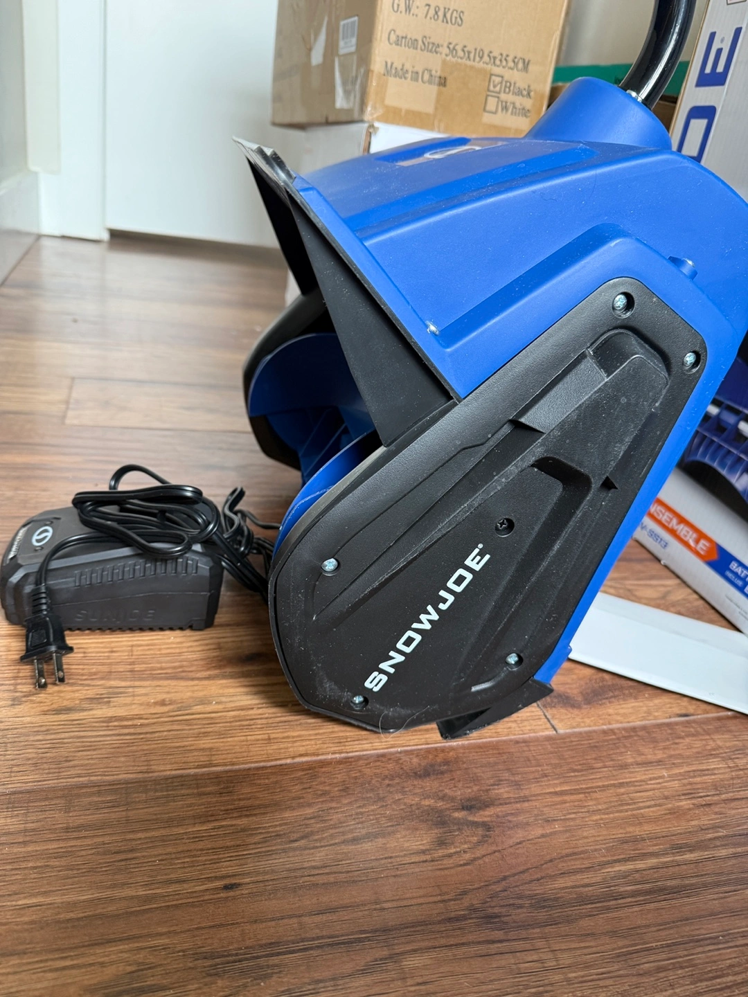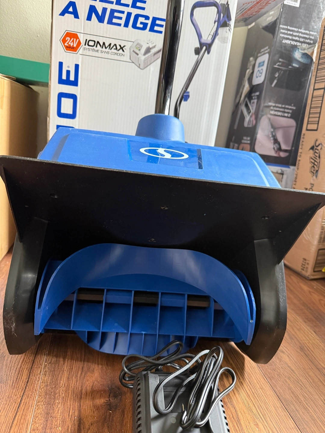 Cordless snow shovel. Blue and black. Includes battery and charger. Great for clearing light snow.