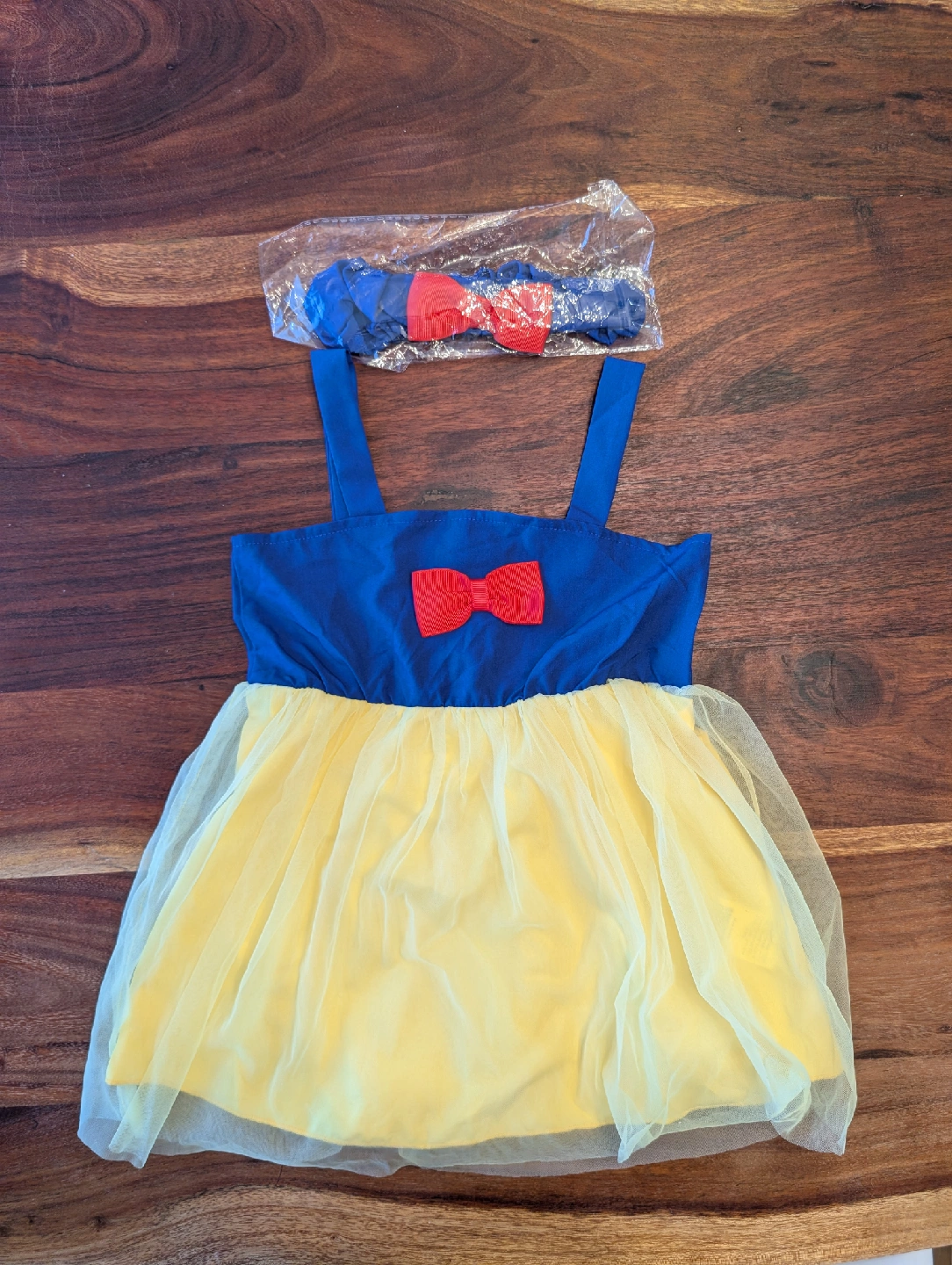 Adorable Snow White costume dress with a matching headband! Perfect for dress-up, a special occasion or Halloween. The dress features a classic design with a blue bodice, yellow skirt, and a cute red bow. Comes with a blue headband with a red bow to complete the look