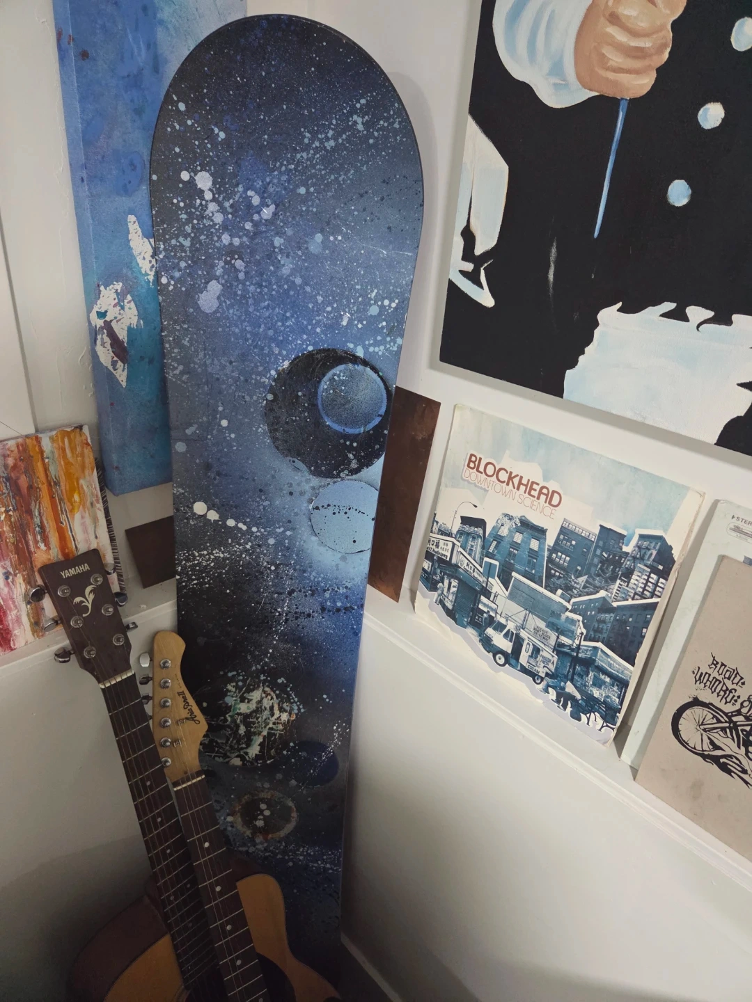 10Selling a snowboard featuring a cool blue galaxy design. It's a unique piece that would look great on the slopes! It's in good condition and ready for some winter fun