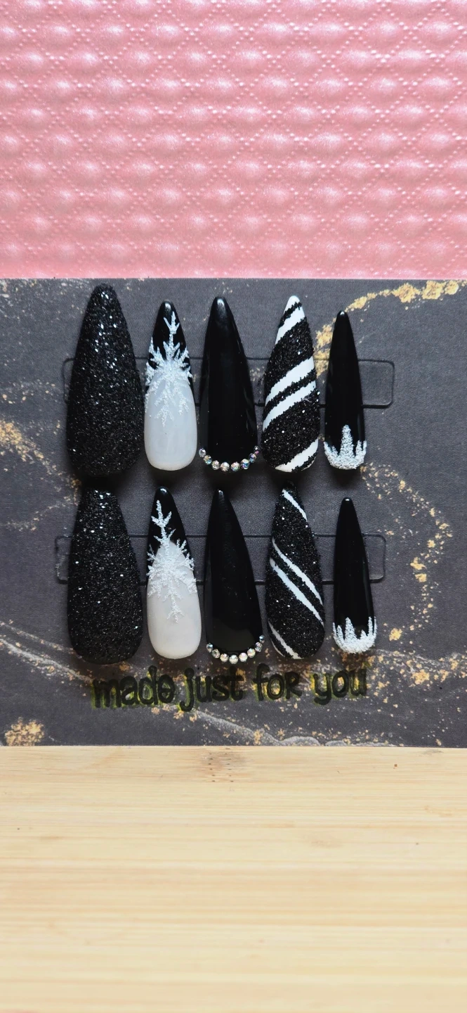 15Bold black, crisp white, and shimmering glitter come together with hand-painted snowflake details and sparkling crystal accents. A striking winter-inspired look with just the right touch of glam. Long stiletto shape, handcrafted perfection. Ready to wear. Made just for you. Medium – 1-6-4-5-8 Every set comes with a prep package including: ● Nail Glue ● Alcohol Wipe ● Wooden Stick ● Nail Adhesive Tab ● Nail File ● Instruction Card DM me if you want a custom set or have questions!