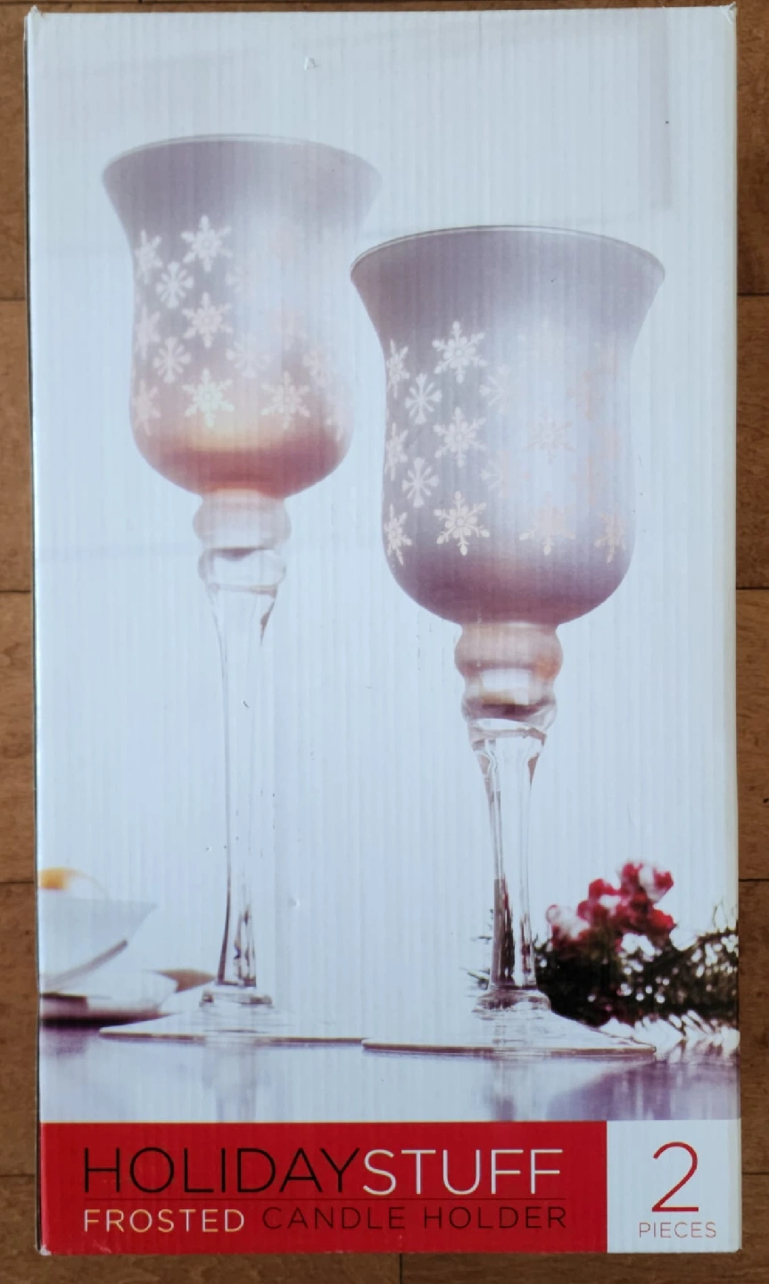 76Selling a Snowflake Design Frosted Candle Holder set. Light up your home with these subtle and attractive frosted glass candle holders this Christmas! The candlelight twinjles through the snowflake design. It comes with two pieces. One is large (11 cm dia. x 33 cm tall or 4.5" dia. x 13" tall) and one is small (10.5 cm dia. x 27 cm tall or 4.25" dia. x 10.75" tall). Suitable for tealight candles (not included)
