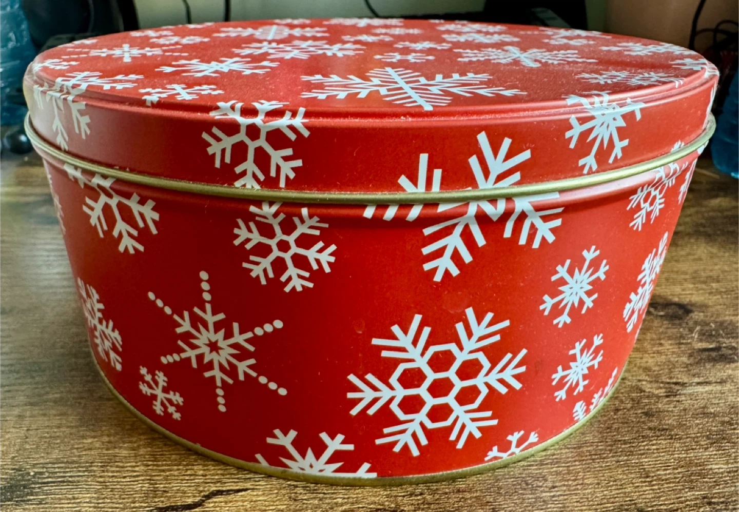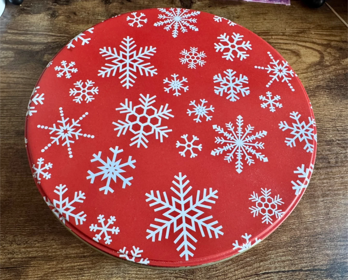 92Selling a round tin with a festive snowflake pattern! It's in great condition and perfect for storing crafts.