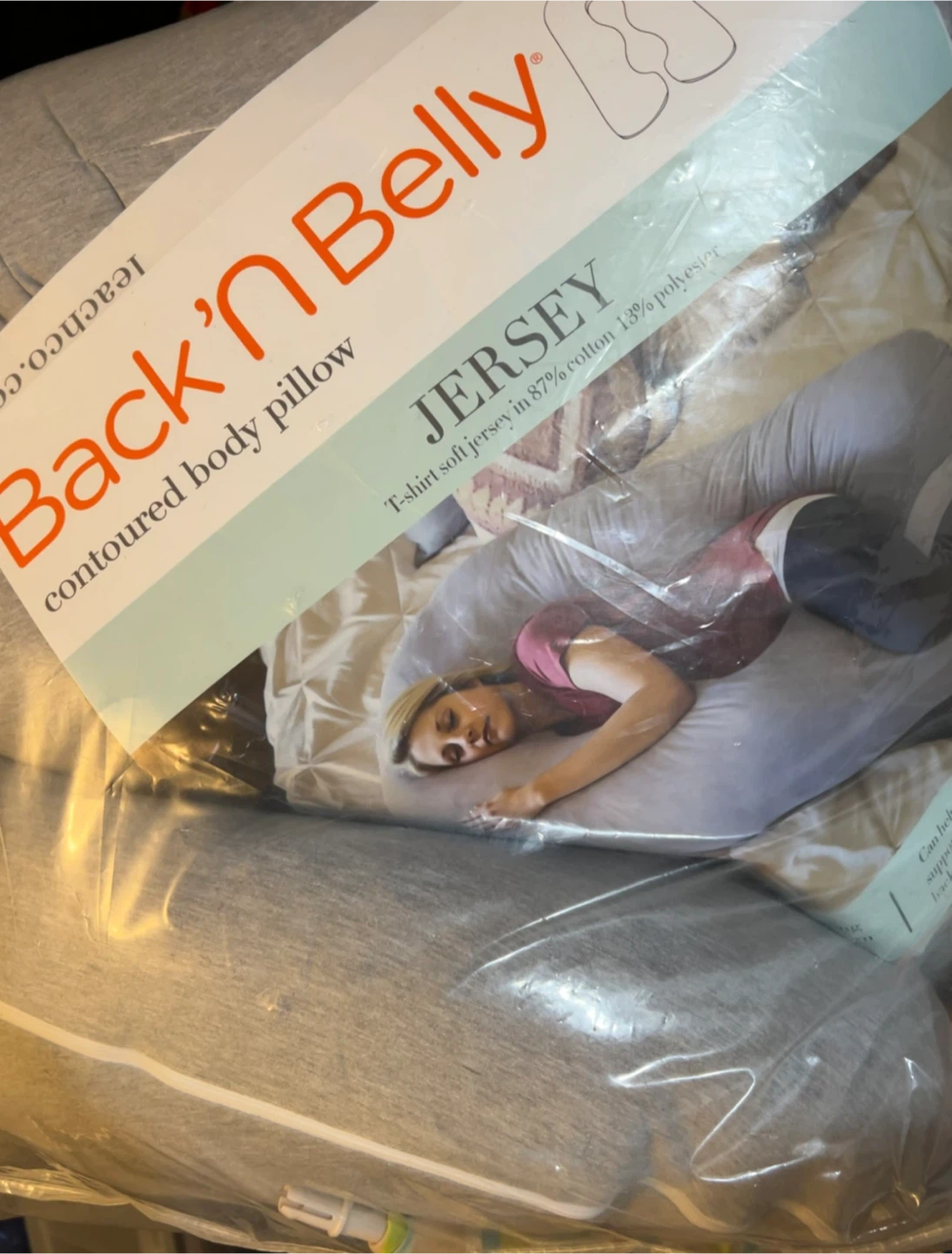 Selling a Back 'N Belly contoured body pillow. It's a jersey knit T-shirt soft jersey in 87% cotton and 13% polyester. Perfect for a good night's sleep!