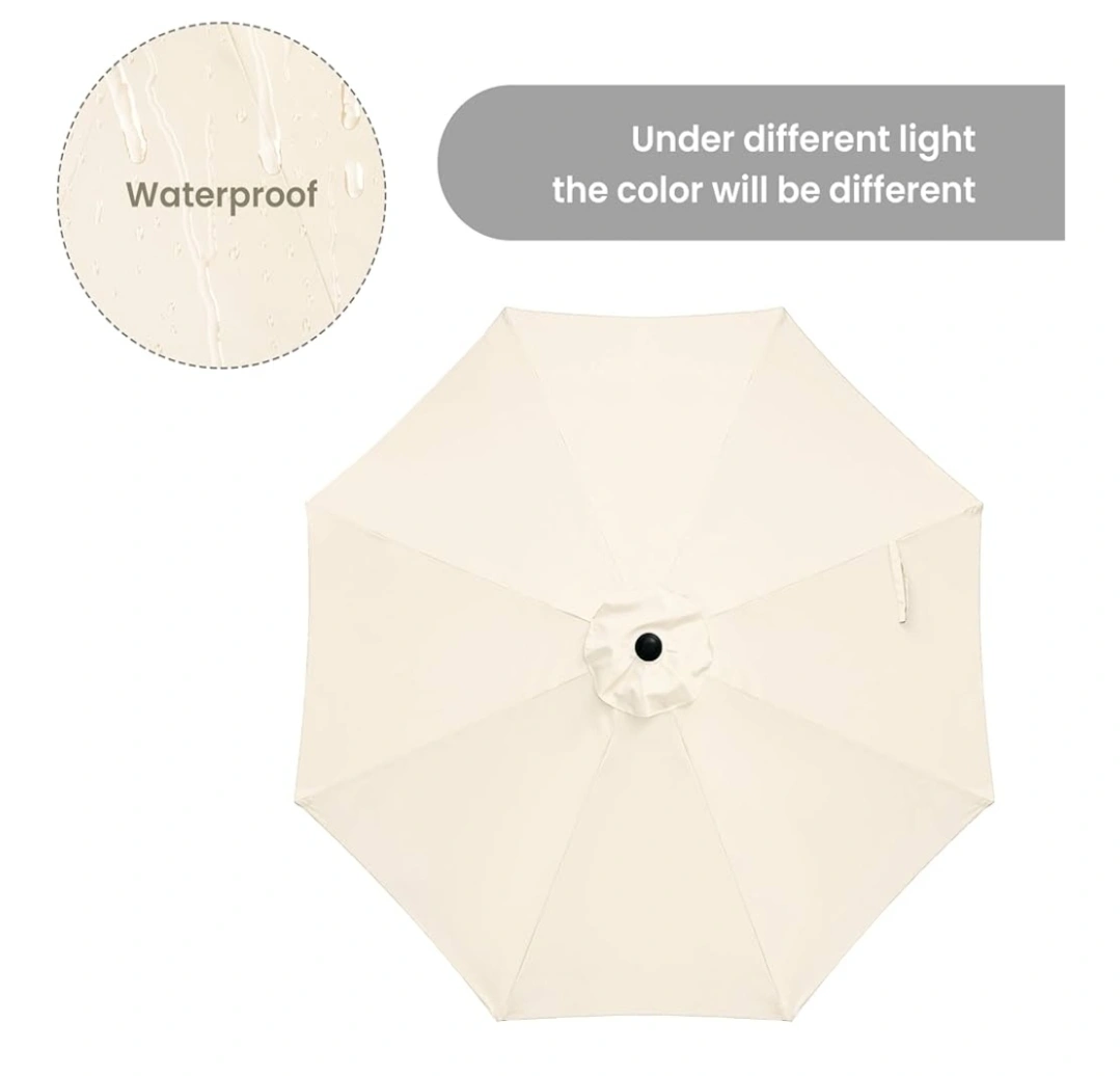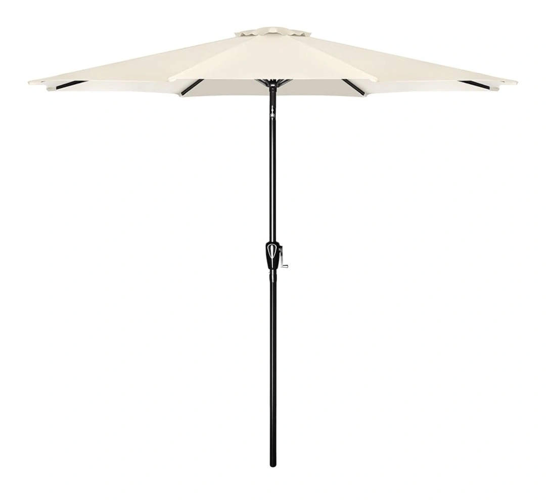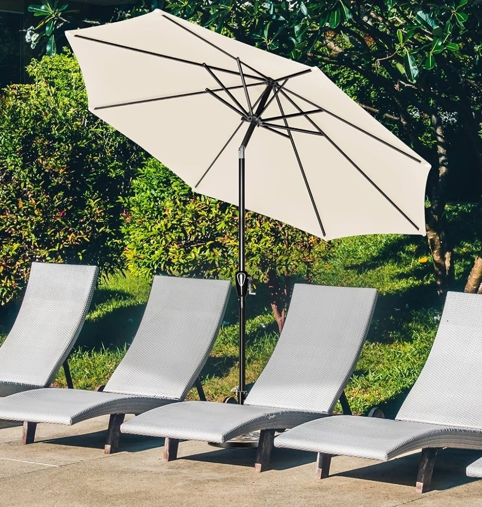 Outdoor patio umbrella. It features a sturdy 8-rib construction and a powder-coated pole for stability and durability. The push-button tilt allows you to easily adjust the angle to block the sun. The magic strap makes folding the umbrella easier, and the press-and-release button allows for efficient assembly and dismount. It is waterproof, so you don't have to worry about the rain!