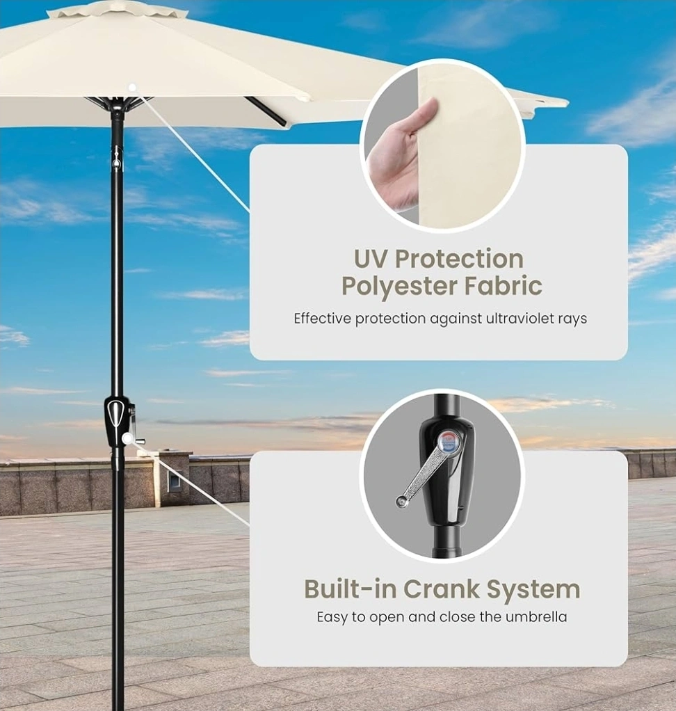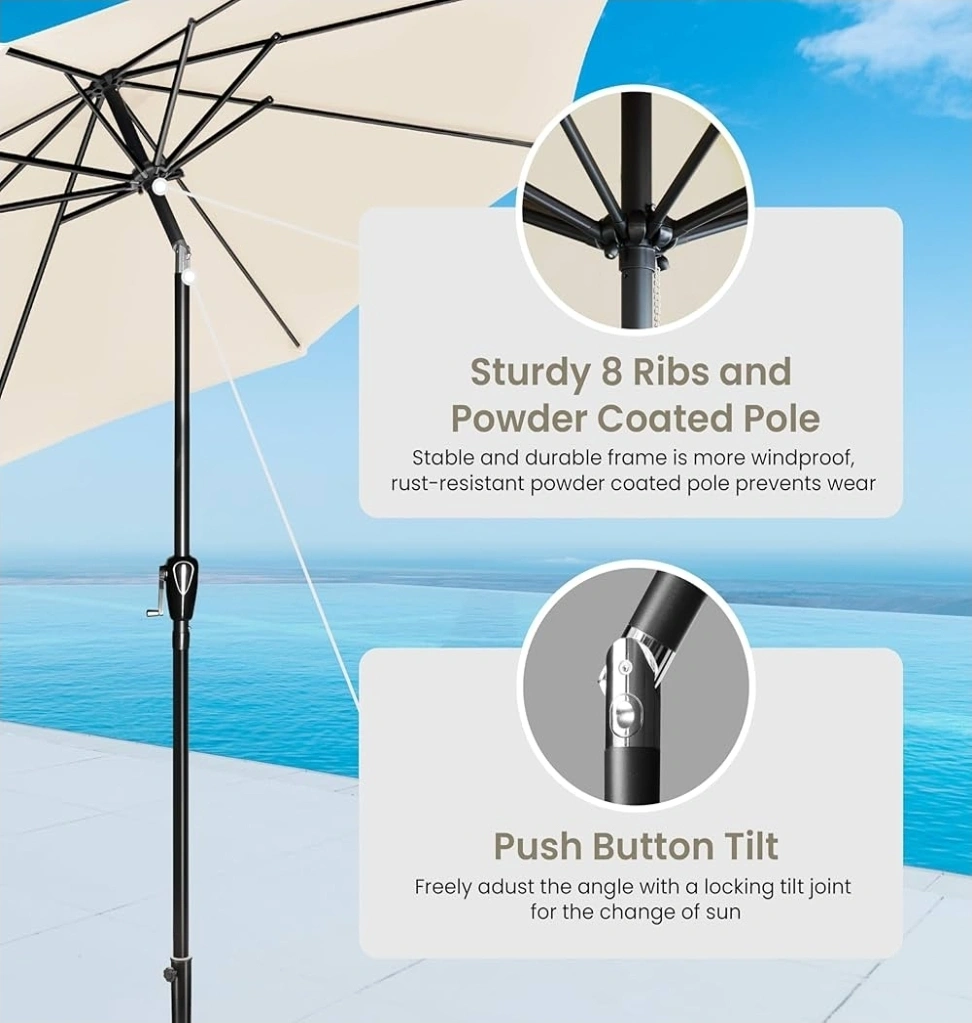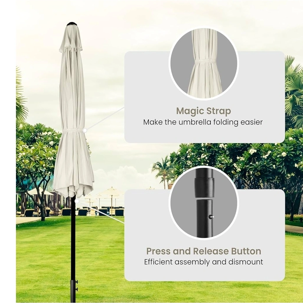 Outdoor patio umbrella. It features a sturdy 8-rib construction and a powder-coated pole for stability and durability. The push-button tilt allows you to easily adjust the angle to block the sun. The magic strap makes folding the umbrella easier, and the press-and-release button allows for efficient assembly and dismount. It is waterproof, so you don't have to worry about the rain!