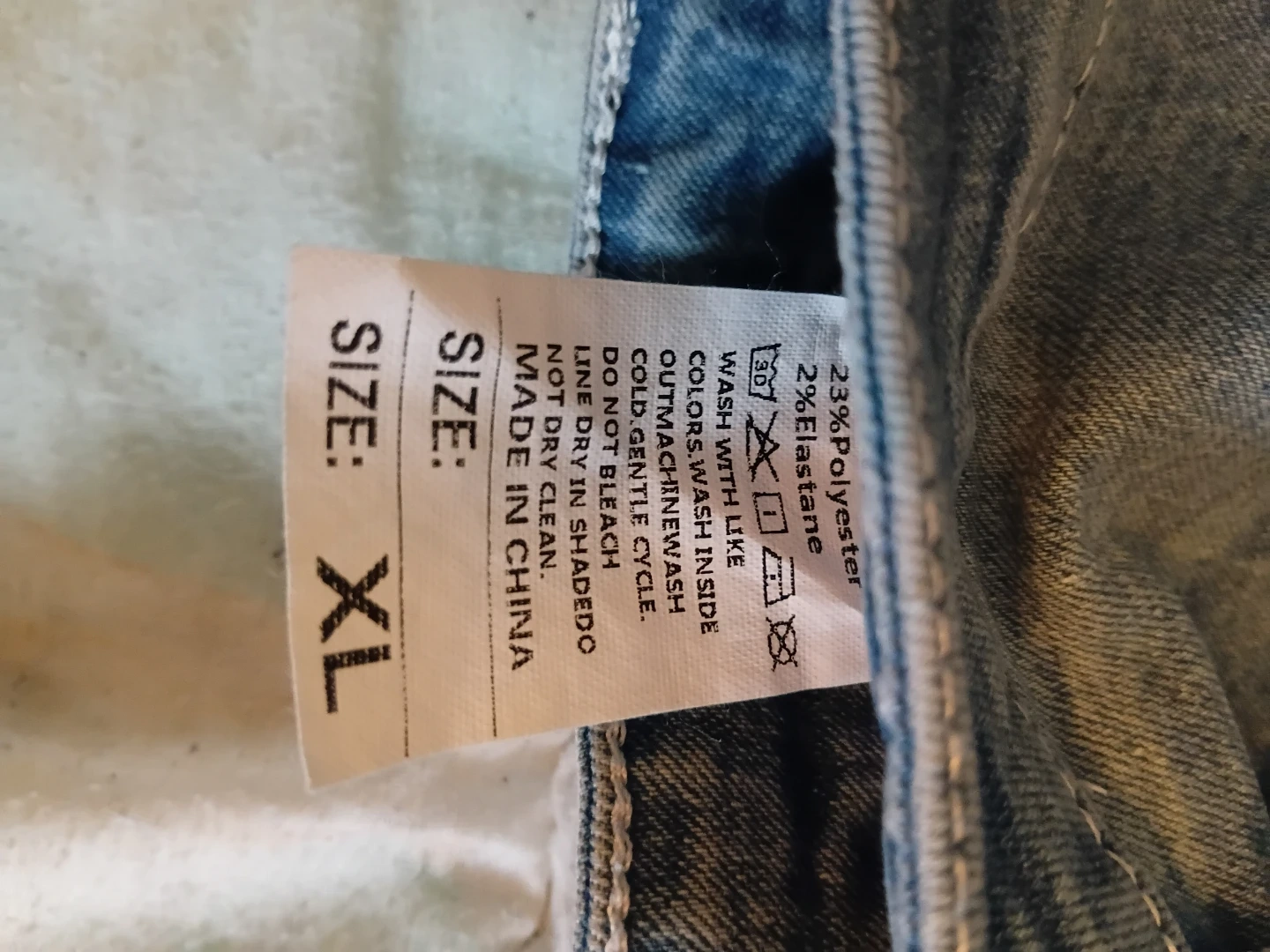 These light wash jeans are made from a polyester and elastane blend. They're a size XL and made in China. Perfect for everyday wear!