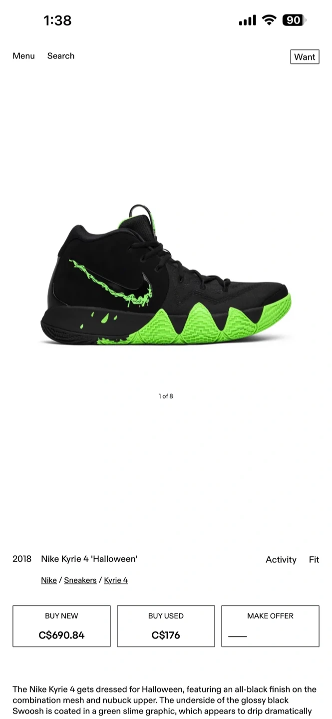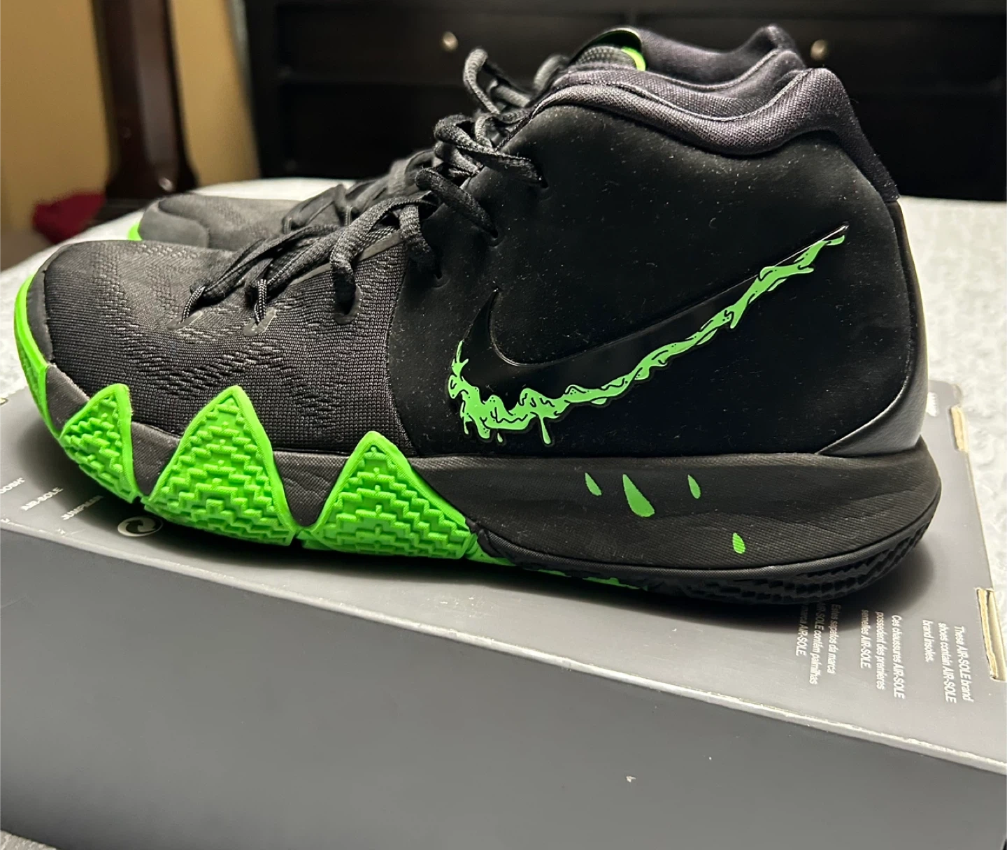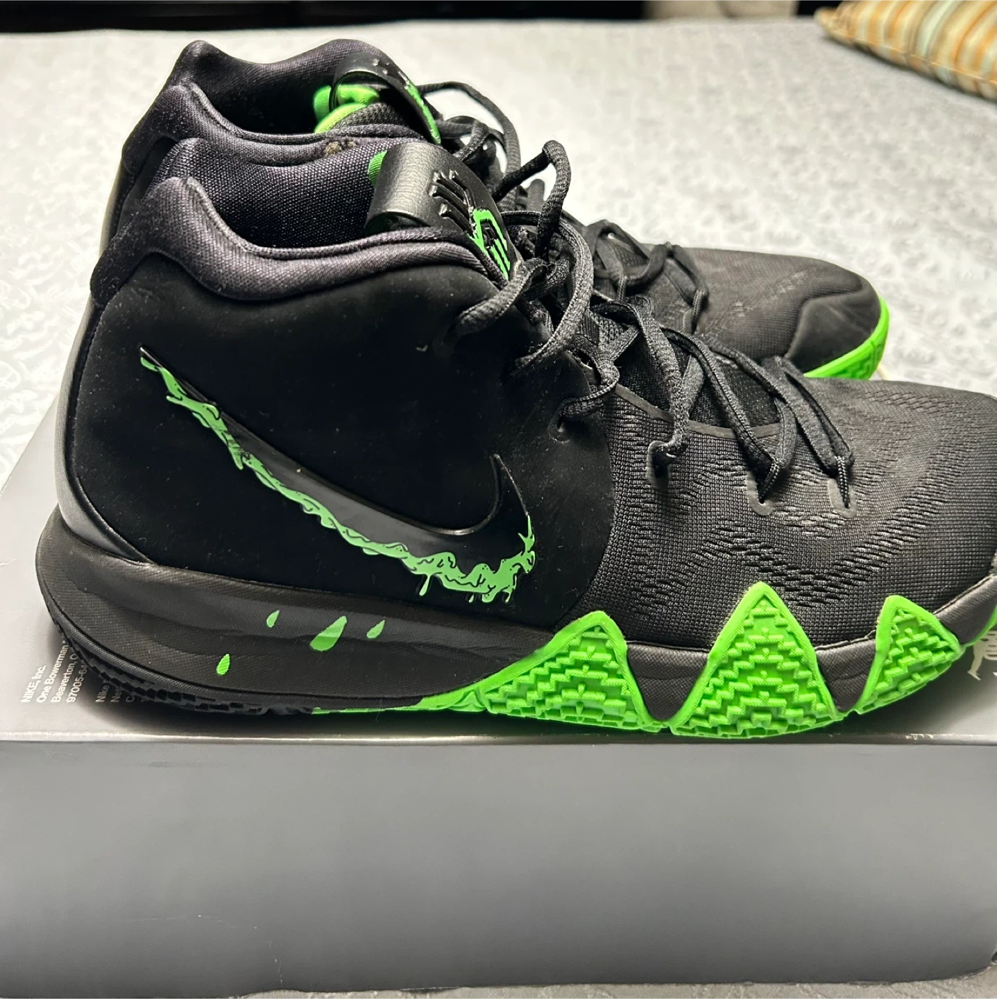 Buy & SellNike Kyrie 4 "Halloween" Basketball ShoesNike Kyrie 4 "Halloween" Basketball Shoes$171Nike Kyrie 4 "Halloween" basketball shoes. Black with neon green accents. Includes original box. Size is not visible on item.SizeMens size 10/ Women’s 11.5/12BrandNikeWHERE TO MEETPolice stationView MapSELLERverifiedMelBrampton E750 reviews0 chats·0 favorites·23 viewsSEND CHAT TO SELLERHi Mel! I’m interested in your listing.Hi Mel! I’m interested in your listing.Get the Karrot app to chatSign In to chat